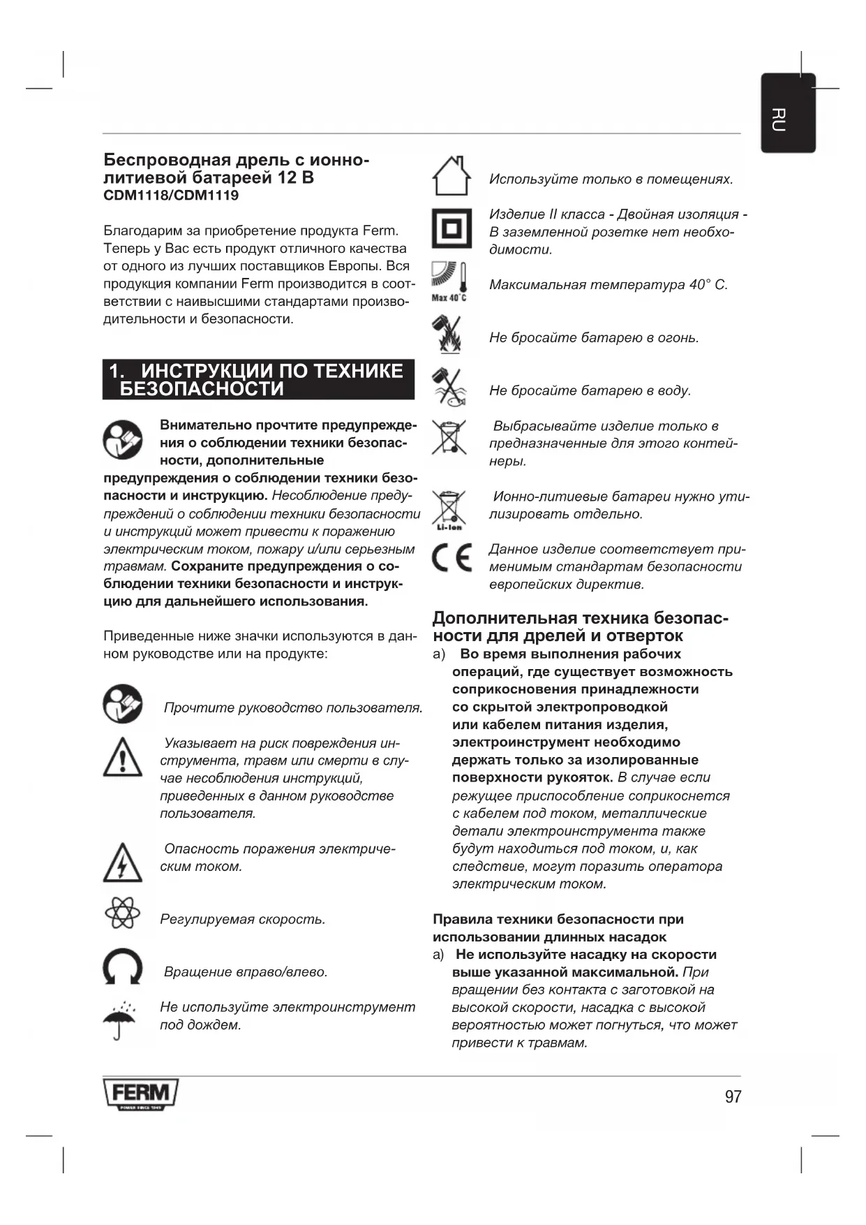 Беспроводная дрель с ионно- литиевой батареей 12 В CDM1118/CDM1119 Благодарим за приобретение продукта Ferm. Теперь у Вас есть продукт отличного качества от одного из лучших поставщиков Европы. Вся продукция компании Ferm производится в соот- ветствии с наивысшими стандартами произво- дительности и безопасности.
