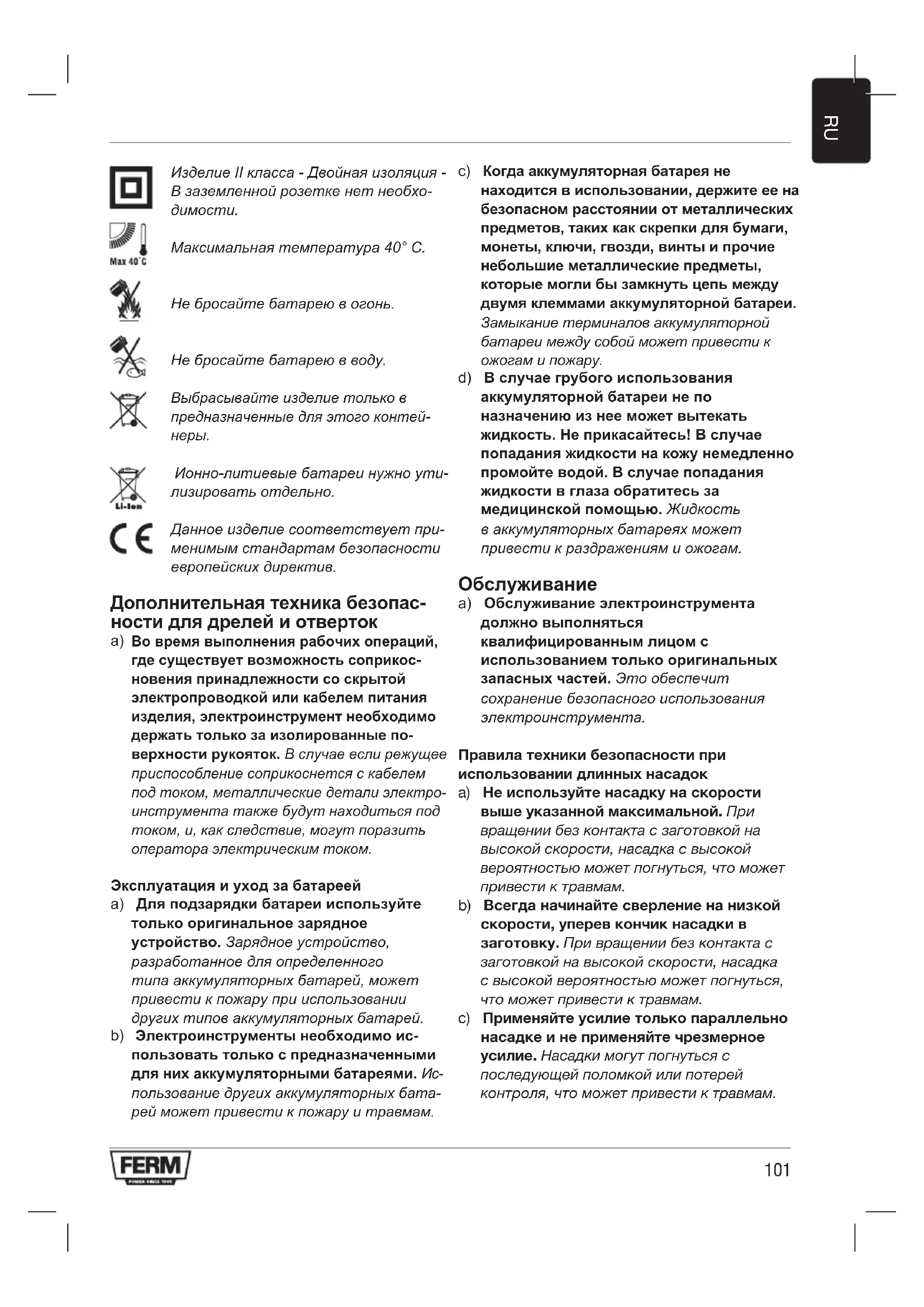 Ионно-литиевые батареи нужно ути- лизировать отдельно. Данное изделие соответствует при- менимым стандартам безопасности европейских директив. Дополнительная техника безопас- ности для дрелей и отверток