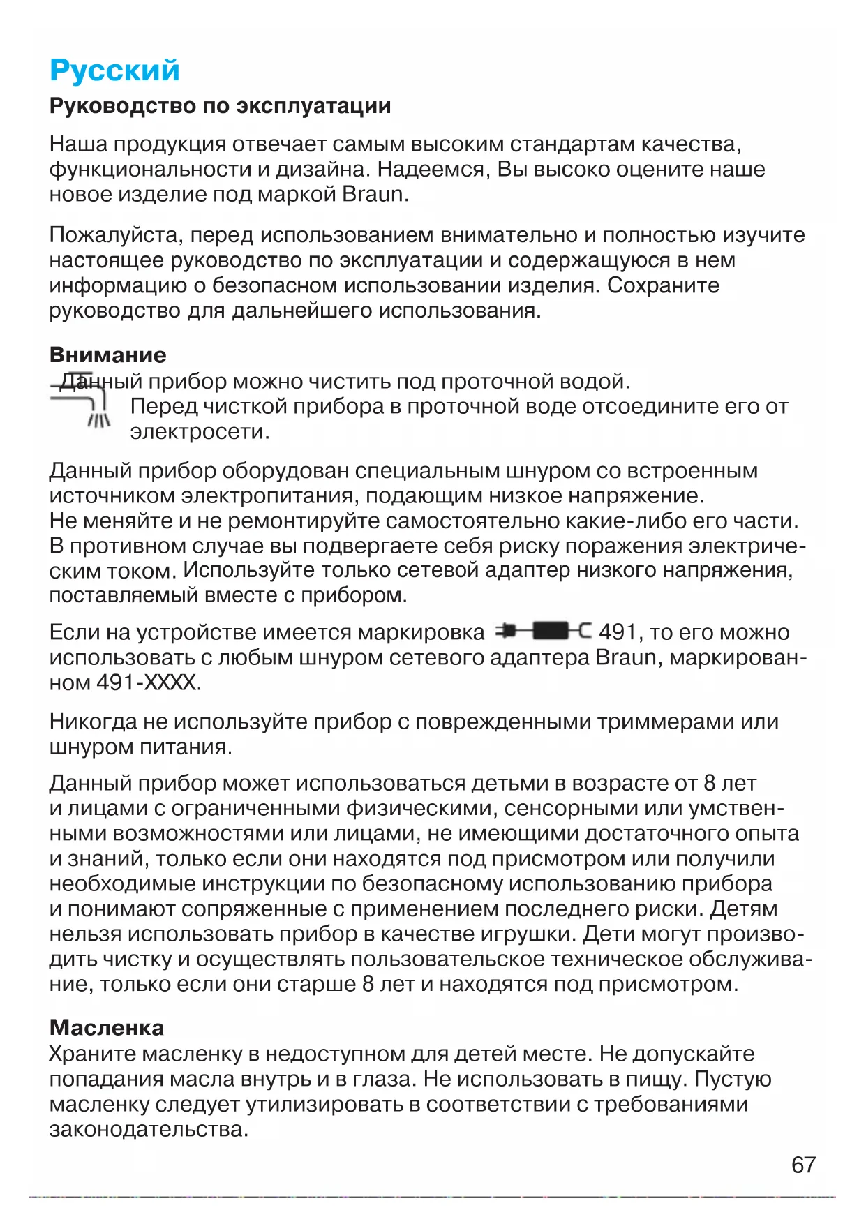 491, то его можно использовать с любым шнуром сетевого адаптера Braun, маркирован- ном 491-ХХХХ. Никогда не используйте прибор с поврежденными триммерами или шнуром питания. Данный прибор может использоваться детьми в возрасте от 8 лет и лицами с ограниченными физическими, сенсорными или умствен- ными возможностями или лицами, не имеющими достаточного опыта и знаний, только если они находятся под присмотром или получили необходимые инструкции по безопасному использованию прибора и понимают сопряженные с применением последнего риски. Детям нельзя использовать прибор в качестве игрушки. Дети могут произво- дить чистку и осуществлять пользовательское техническое обслужива- ние, только если они старше 8 лет и находятся под присмотром.