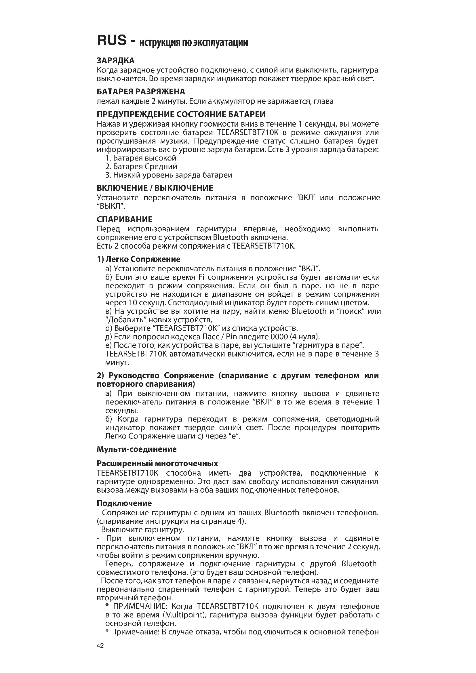 а) Установите переключатель питания в положение “ВКЛ”. б) Если это ваше время Fi сопряжения устройства будет автоматически переходит в режим сопряжения. Если он был в паре, но не в паре устройство не находится в диапазоне он войдет в режим сопряжения через 10 секунд. Светодиодный индикатор будет гореть синим цветом. в) На устройстве вы хотите на пару, найти меню Bluetooth и “поиск” или “Добавить” новых устройств. d) Выберите “TEEARSETBT710K” из списка устройств. д) Если попросил кодекса Пасс / Pin введите 0000 (4 нуля). е) После того, как устройства в паре, вы услышите “гарнитура в паре”. TEEARSETBT710K автоматически выключится, если не в паре в течение 3