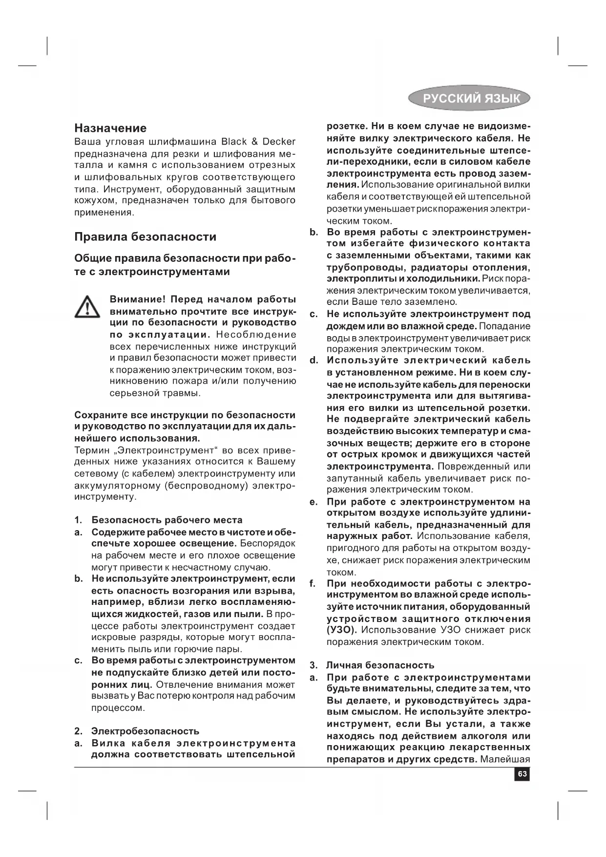 Ваша угловая шлифмашина Black & Decker предназначена для резки и шлифования ме- талла и камня с использованием отрезных и шлифовальных кругов соответствующего типа. Инструмент, оборудованный защитным кожухом, предназначен только для бытового применения. Правила безопасности Общие правила безопасности при рабо- те с электроинструментами Внимание! Перед началом работы внимательно прочтите все инструк- ции по безопасности и руководство по эксплуатации. Несоблюдение всех перечисленных ниже инструкций и правил безопасности может привести к поражению электрическим током, воз- никновению пожара и/или получению серьезной травмы. Сохраните все инструкции по безопасности и руководство по эксплуатации для их даль- нейшего использования