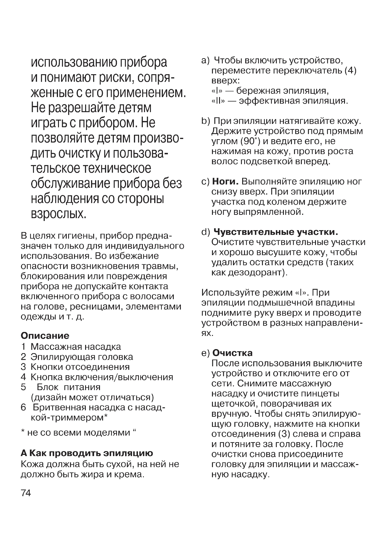 В целях гигиены, прибор предна- значен только для индивидуального использования. Во избежание опасности возникновения травмы, блокирования или повреждения прибора не допускайте контакта включенного прибора с волосами на голове, ресницами, элементами одежды и т. д.