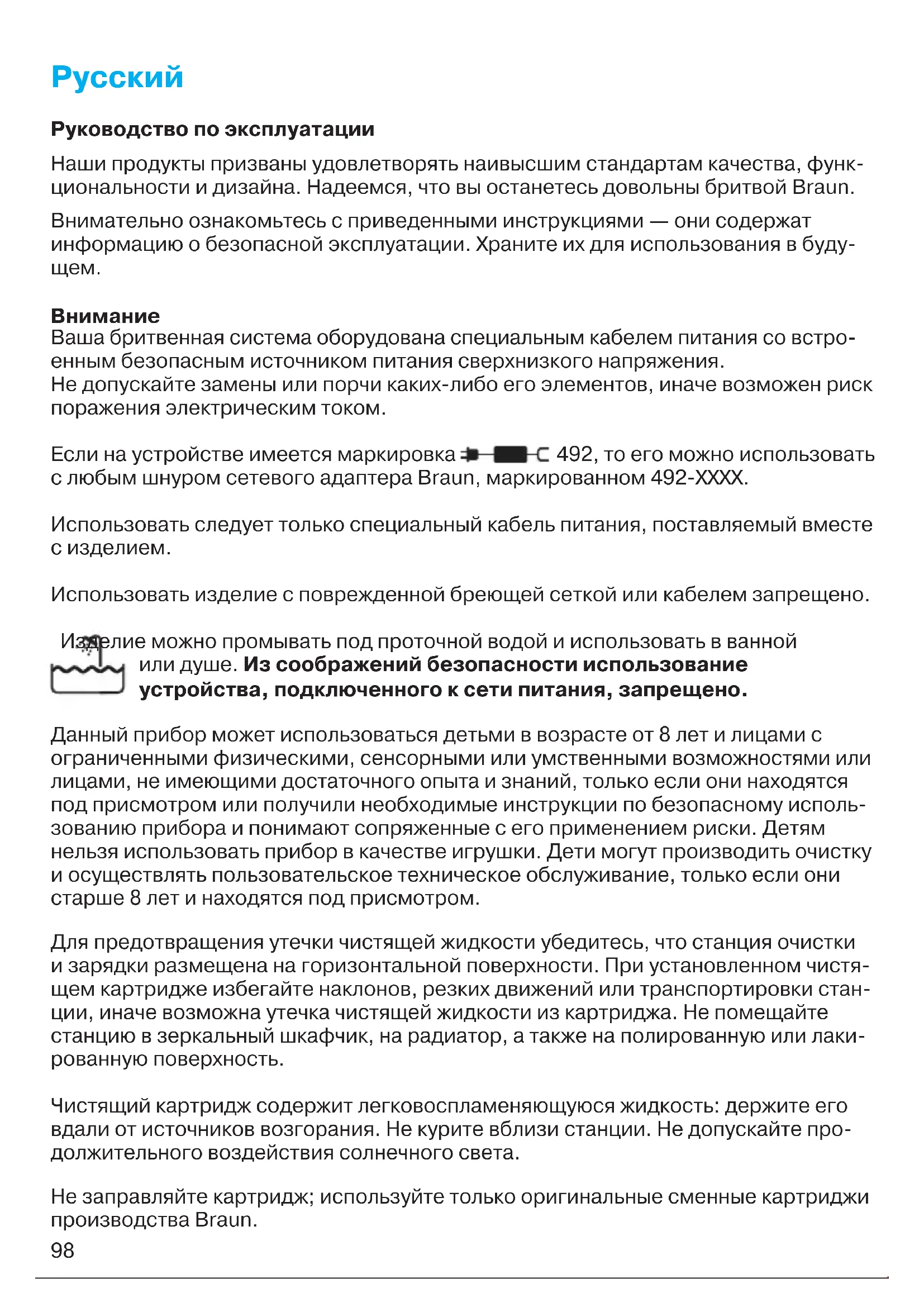 492, то его можно использовать с любым шнуром сетевого адаптера Braun, маркированном 492-ХХХХ. Использовать следует только специальный кабель питания, поставляемый вместе с изделием. Использовать изделие с поврежденной бреющей сеткой или кабелем запрещено. Изделие можно промывать под проточной водой и использовать в ванной или душе. Из соображений безопасности использование устройства, подключенного к сети питания, запрещено. Данный прибор может использоваться детьми в возрасте от 8 лет и лицами с ограниченными физическими, сенсорными или умственными возможностями или лицами, не имеющими достаточного опыта и знаний, только если они находятся под присмотром или получили необходимые инструкции по безопасному исполь- зованию прибора и понимают сопряженные с его применением риски. Детям нельзя использовать прибор в качестве игрушки. Дети могут производить очистку и осуществлять пользовательское техническое обслуживание, только если они старше 8 лет и находятся под присмотром. Для предотвращения утечки чистящей жидкости убедитесь, что станция очистки и зарядки размещена на горизонтальной поверхности. При установленном чистя- щем картридже избегайте наклонов, резких движений или транспортировки стан- ции, иначе возможна утечка чистящей жидкости из картриджа. Не помещайте станцию в зеркальный шкафчик, на радиатор, а также на полированную или лаки- рованную поверхность. Чистящий картридж содержит легковоспламеняющуюся жидкость: держите его вдали от источников возгорания. Не курите вблизи станции. Не допускайте про- должительного воздействия солнечного света. Не заправляйте картридж; используйте только оригинальные сменные картриджи производства Braun. 91445704_7880cc_7867cc_7865CC_7850cc_CEMEA_S6-132.indd 9891445704_7880cc_7867cc_7865CC_7850cc_CEMEA_S6-132.indd 98 18.04.17 15:2018.04.17 15:20 CSS APPROVED Effective Date 11May2017 GMT - Printed 31Aug2017 Page 98 of 13299 Описание и комплектность Станция очистки и зарядки 1 Экран состояния чистящей