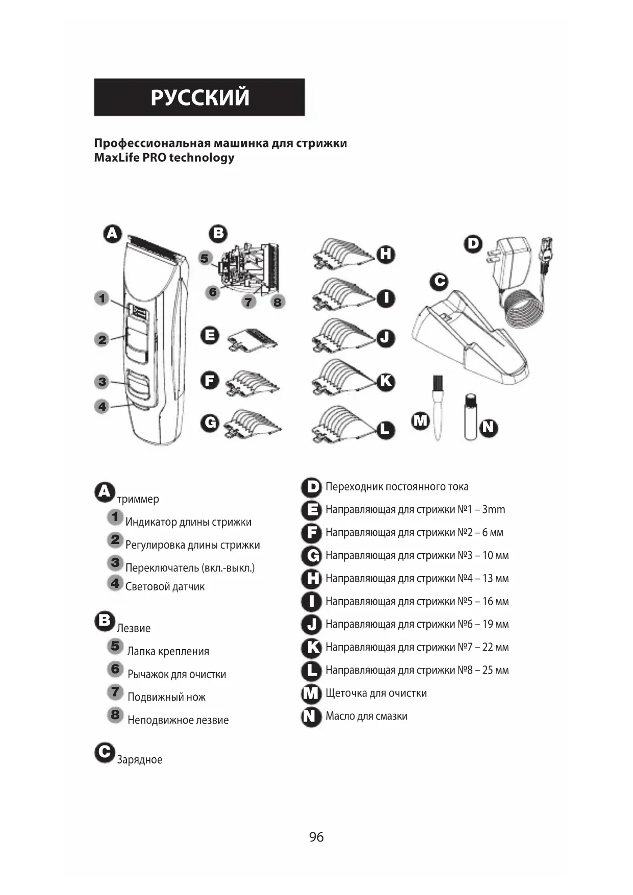 РУССКИЙ97 ПЕРЕД ИСПОЛЬЗОВАНИЕМ Данная машинка предназначена для профессиональной стрижки волос и бороды. Перед первым использованием машинку следует оставить на зарядке в течение 3 часов, чтобы активизировать аккумуляторную батарейку. Данная машинка работает от батарейки или от сети при подключении переходника. Внимательно ознакомьтесь с инструкциями перед тем, как использовать