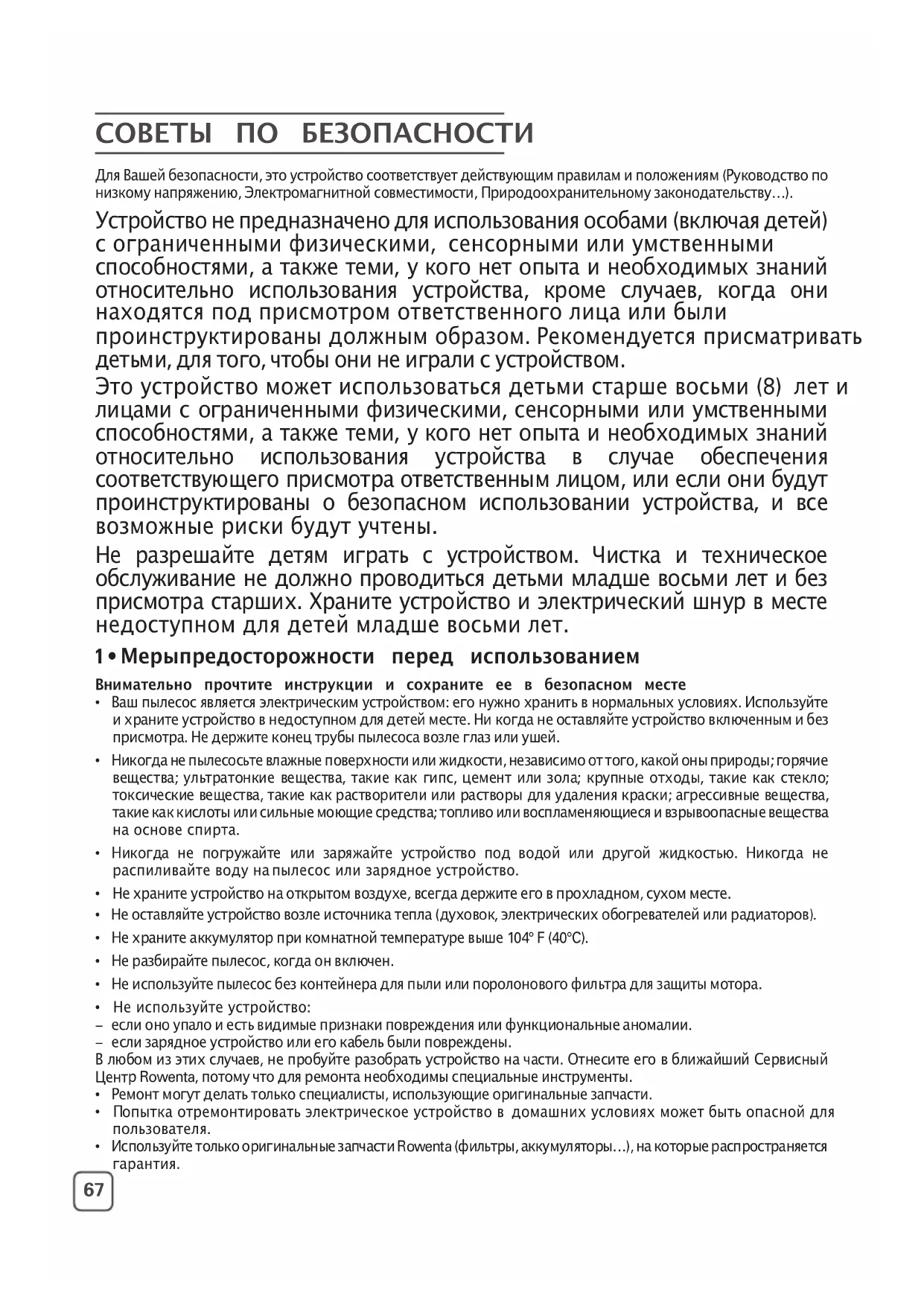 - Используйте только оригинальные запчасти Rowenta (фильтры, аккумуляторы…), на которые распространяется гарантия.RU