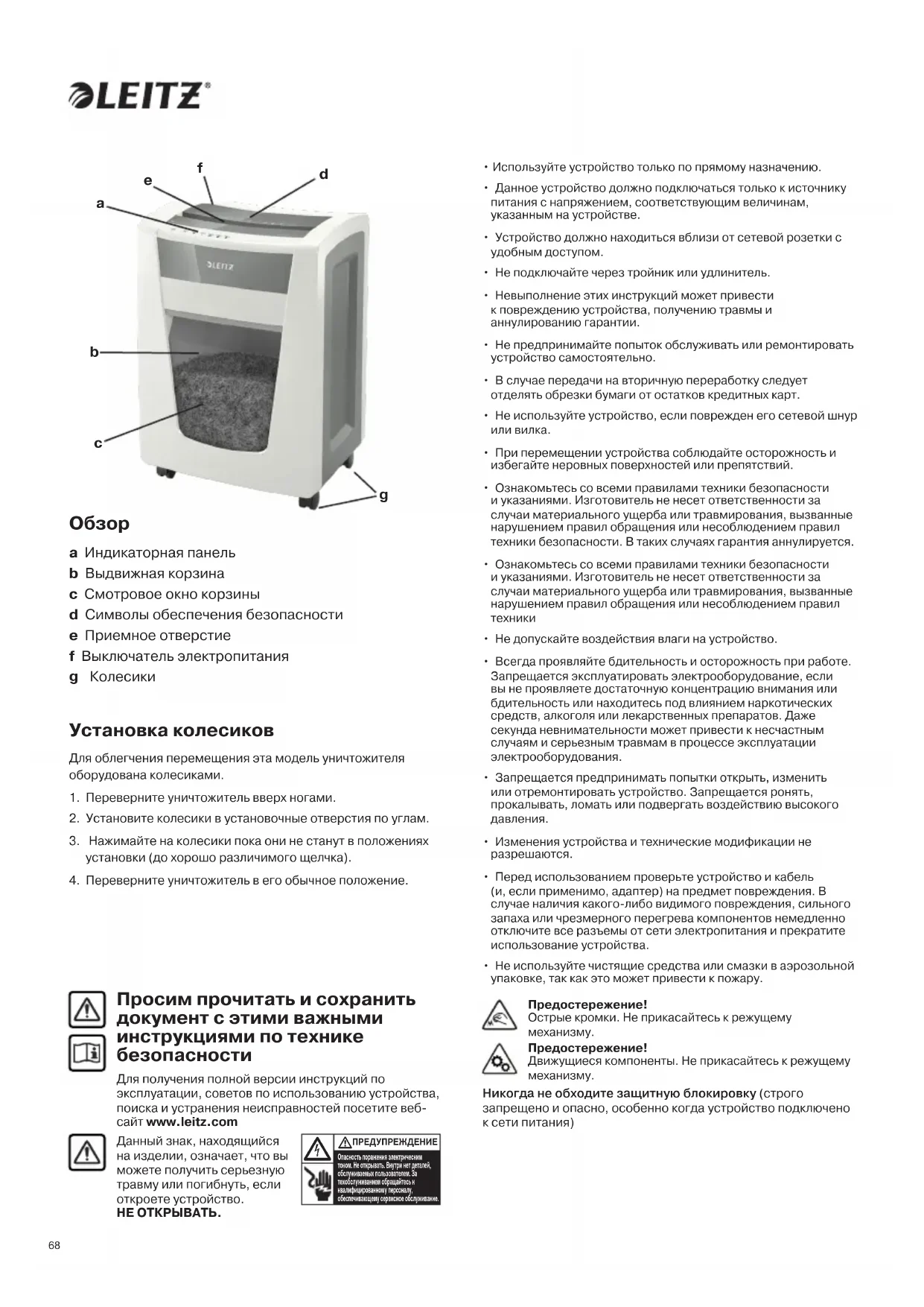 - Используйте устройство только по прямому назначению.• Данное устройство должно подключаться только к источнику питания с напряжением, соответствующим величинам, указанным на устройстве.• Устройство должно находиться вблизи от сетевой розетки с удобным доступом.• Не подключайте через тройник или удлинитель.• Невыполнение этих инструкций может привести к повреждению устройства, получению травмы и аннулированию гарантии.• Не предпринимайте попыток обслуживать или ремонтировать устройство самостоятельно.• В случае передачи на вторичную переработку следует отделять обрезки бумаги от остатков кредитных карт.• Не используйте устройство, если поврежден его сетевой шнур или вилка.• При перемещении устройства соблюдайте осторожность и избегайте неровных поверхностей или препятствий.• Ознакомьтесь со всеми правилами техники безопасности и указаниями. Изготовитель не несет ответственности за случаи материального ущерба или травмирования, вызванные нарушением правил обращения или несоблюдением правил техники безопасности. В таких случаях гарантия аннулируется.• Ознакомьтесь со всеми правилами техники безопасности и указаниями. Изготовитель не несет ответственности за случаи материального ущерба или травмирования, вызванные нарушением правил обращения или несоблюдением правил техники• Не допускайте воздействия влаги на устройство.• Всегда проявляйте бдительность и осторожность при работе. Запрещается эксплуатировать электрооборудование, если вы не проявляете достаточную концентрацию внимания или бдительность или находитесь под влиянием наркотических средств, алкоголя или лекарственных препаратов. Даже секунда невнимательности может привести к несчастным случаям и серьезным травмам в процессе эксплуатации электрооборудования.• Запрещается предпринимать попытки открыть, изменить или отремонтировать устройство. Запрещается ронять, прокалывать, ломать или подвергать воздействию высокого давления.• Изменения устройства и технические модификации не разрешаются.• Перед использованием проверьте устройство и кабель (и, если применимо, адаптер) на предмет повреждения. В случае наличия какого-либо видимого повреждения, сильного запаха или чрезмерного перегрева компонентов немедленно отключите все разъемы от сети электропитания и прекратите использование устройства.• Не используйте чистящие средства или смазки в аэрозольной упаковке, так как это может привести к пожару. Просим прочитать и сохранить документ с этими важными инструкциями по технике безопасности Для получения полной версии инструкций по эксплуатации, советов по использованию устройства, поиска и устранения неисправностей посетите веб- сайт www.leitz.com Данный знак, находящийся на изделии, означает, что вы можете получить серьезную травму или погибнуть, если откроете устройство. НЕ ОТКРЫВАТЬ. Опасность поражения электрическим током. Не открывать. Внутри нет деталей, обслуживаемых пользователем. За техобслуживанием обращайтесь к квалифицированному персоналу, обеспечивающему сервисное обслуживание. ПРЕДУПРЕЖДЕНИЕ