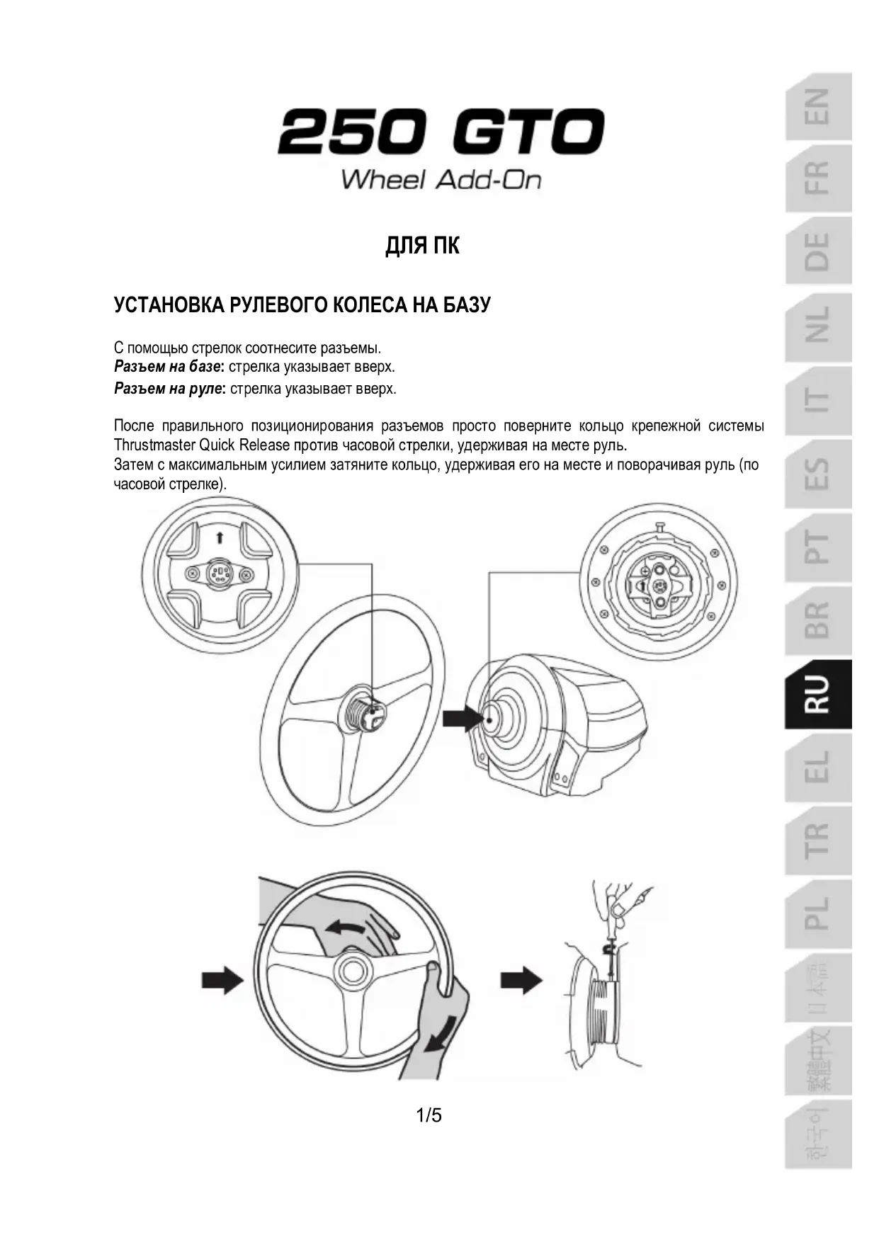 Не прилагайте чрезмерных усилий при затягивании малого крепежного винта (с помощью отвертки Phillips)! Прекратите затягивание, как только почувствуете сопротивление ВАЖНАЯ ИНФОРМАЦИЯ! Для обеспечения надлежащей работы рулевого колеса 250 GTO Wheel Add-On с базой для руля (например, TS-PC Racer, TS-XW Racer, T-GT, TX, T300 или T500) требуется обновить прошивку базы, загрузив последнюю версию прошивки с сайта https://support.thrustmaster.com (выберите «Гоночные рули / [наименование базы] / Прошивка» и выполните указания по загрузке и установке).3/5 Сведения о потребительской гарантии Корпорация Guillemot Corporation S.A., зарегистрированная по адресу Place du Granier, B.P. 97143, 35571 Chantepie, Франция, (далее — «Guillemot») гарантирует своим клиентам во всем мире, что в данном изделии Thrustmaster не будет выявлено никаких дефектов материалов и производства в течение гарантийного периода, который равен сроку предъявления претензии по соответствию для данного изделия. В странах Европейского Союза этот срок соответствует двум (2) годам с момента поставки изделия Thrustmaster. В других странах гарантийный период равен сроку предъявления претензии по соответствию для изделия Thrustmaster, определяемому соответствующим законодательством страны, в которой проживал потребитель на момент приобретения изделия Thrustmaster (если подобные претензии не действуют в соответствующей стране, гарантийный период равняется одному (1) году с первоначальной даты приобретения изделия Thrustmaster). В случае обнаружения дефектов изделия во время гарантийного периода незамедлительно обратитесь в службу технической поддержки, сотрудники которой определят дальнейшую процедуру. Если дефект будет подтвержден, изделие следует вернуть по месту приобретения (или в любое другое место, указанное службой технической поддержки). В рамках действия гарантии дефектное изделие будет, по усмотрению службы технической поддержки, заменено или возвращено в рабочее состояние. Если в течение гарантийного срока изделие Thrustmaster будет подвержено такому восстановлению, к оставшемуся гарантийному сроку прибавляется период времени, но не менее семи (7) дней, во время которого изделие находилось вне употребления (началом этого периода считается дата запроса покупателя о вмешательстве или дата предоставления дефектного изделия для восстановления, если изделие было предоставлено для восстановления позднее, чем был сделан запрос о вмешательстве). В мере, разрешенной применимым законодательством, полная ответственность компании Guillemot и ее дочерних компаний (в том числе косвенный ущерб) ограничивается восстановлением рабочего состояния или заменой изделия Thrustmaster. В мере, разрешенной применимым законодательством, компания Guillemot отказывается от любых гарантий коммерческой пригодности или пригодности для определенной цели. Настоящая гарантия не распространяется: (1) на ситуации, когда изделие было видоизменено, открыто, модифицировано или получило повреждения в результате недопустимого или неправильного использования, небрежности или несчастного случая, естественного износа или любой другой причины, не связанной с дефектом материалов или производства (включая, помимо прочего, использование изделия Thrustmaster совместно с любыми неподходящими элементами, в частности — с блоками питания, аккумуляторами, зарядными устройствами и любыми другими элементами, не входящими 