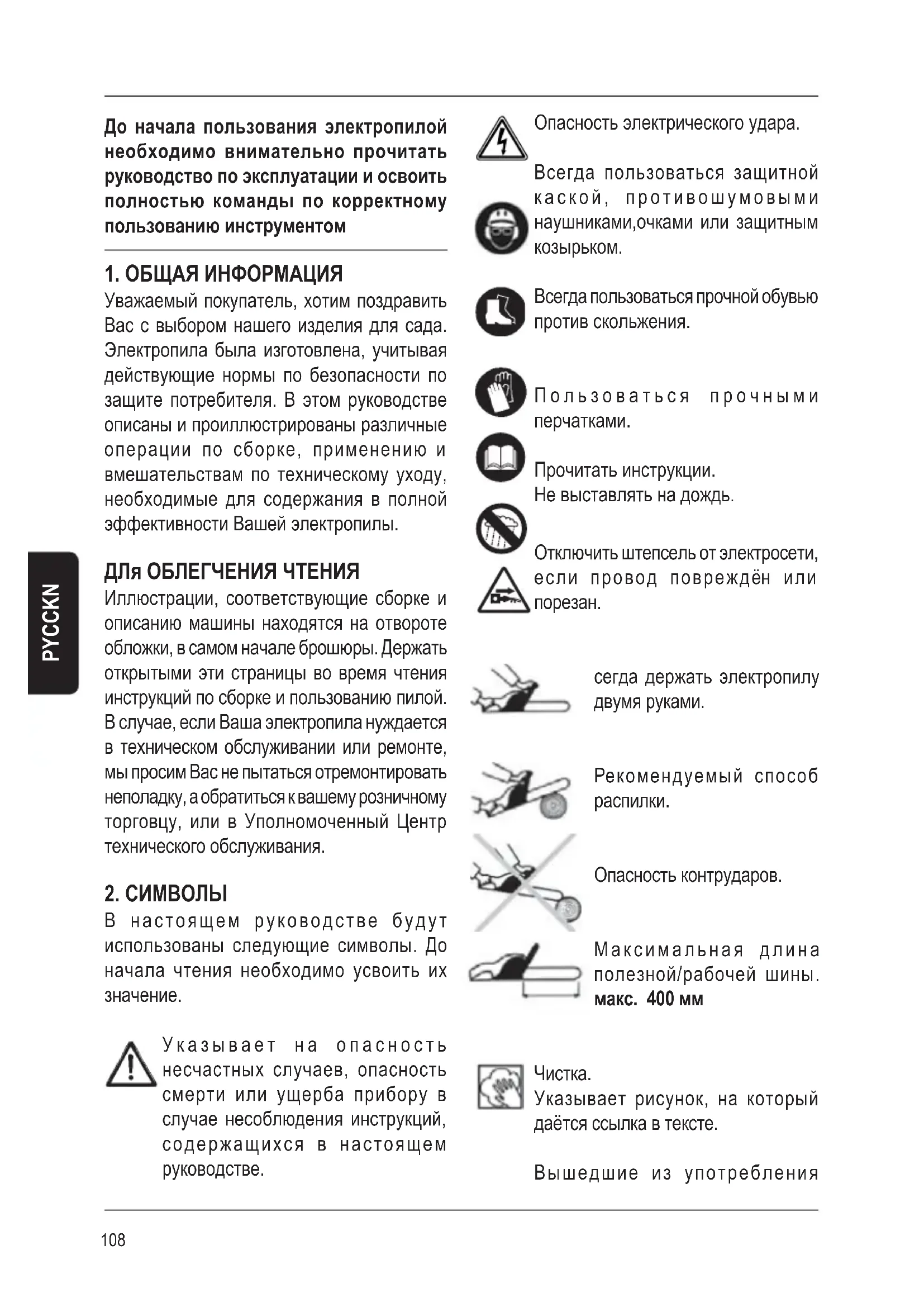 БЕЗОПАСНОСТИ До начала пользования электропилой необходимо внимательно прочитать руководство по эксплуатации и освоить полностью команды по корректному пользованию инструментом, кроме того, необходимо хранить настоящее руководство для будущих консультаций. Не позволять пользование электропилой детям илюдям, не ознакомленным полностью с настоящими инструкциями. Пользуясь электрическими режущими инструментами, необходимо всегда соблюдать основные меры предосторожности для уменьшения риска пожаров, ударов электрическим током и ранений людей. Предохраняться от ударов электрическим током и избегать контакта тела с заземлёнными поверхностями, или поверхностями,замкнутыми на корпус. #Убирать на хранение неиспользуемый режущий инструмент. Когда не используется, режущий инструмент должен быть убран в сухое место и находиться на высоте, быть закрытым, вне доступа для детей. #Не форсировать режущий инструмент. Он будет выполнять работу лучше и будет более безопасным на скорости, для которой предусмотрен. #Грязные среда и рабочие столы могут способствовать образованию пожаров. #Не подвергать режущий инструмент влажности. Не использовать режущие инструменты в местах с загазированной или воспламеняющейся атмосферой. #Для пользования электропилой необходимо хорошо себя чувствовать. Не пользоваться электропилой в условиях усталости, недомогания или под действием наркотиков. #В фазе запуска и во время её работы, всегда держать электропилу на соответствующем расстоянии от тела и одежды оператора. #Не заводить электропилу, когда она перевёрнута. #Убедиться, чтобы ничего не находилось в контакте с цепью в фазе запуска пилы. #Помнить, что на момент выключения электропила продолжает работать ещё на протяжении нескольких минут. #Быть внимательными к материалу, проецированному от распилочного устройства. #Не запускать и не пользоваться электропилой вблизи людей, животных или предметов. #Во время функционирования рекомендуется минимальная дистанция в 10 м между машиной и другими людьми. #Поддерживать устройство всегда двумя