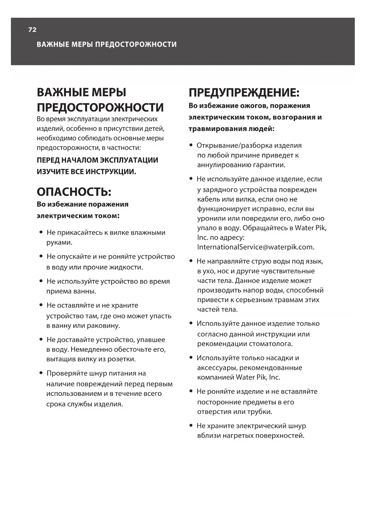 - Не используйте данное изделие, если у зарядного устройства поврежден кабель или вилка, если оно не функционирует исправно, если вы уронили или повредили его, либо оно упало в воду. Обращайтесь в Water Pik, Inc. по адресу: InternationalService@waterpik.com.