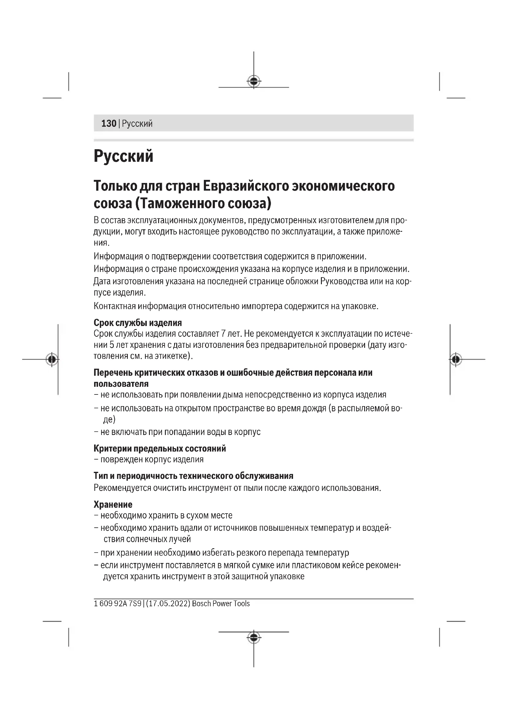 – необходимо хранить в сухом месте – необходимо хранить вдали от источников повышенных температур и воздей- ствия солнечных лучей – при хранении необходимо избегать резкого перепада температур – если инструмент поставляется в мягкой сумке или пластиковом кейсе рекомен- дуется хранить инструмент в этой защитной упаковке 1 609 92A 7S9 | (17.05.2022) Bosch Power ToolsРусский | 131 – подробные требования к условиям хранения смотрите в ГОСТ 15150-69 (Усло- вие 1) Транспортировка – категорически не допускается падение и любые механические воздействия на упаковку при транспортировке – при разгрузке/погрузке не допускается использование любого вида техники, ра- ботающей по принципу зажима упаковки – подробные требования к условиям транспортировки смотрите в ГОСТ 15150-69 (Условие 5) Указания по технике безопасности Прочитайте и выполняйте все указания. Использование изме- рительного инструмента не в соответствии с настоящими ука- заниями чревато повреждением интегрированных защитных механизмов. ПОЖАЛУЙСТА, НАДЕЖНО ХРАНИТЕ ЭТИ УКАЗА-