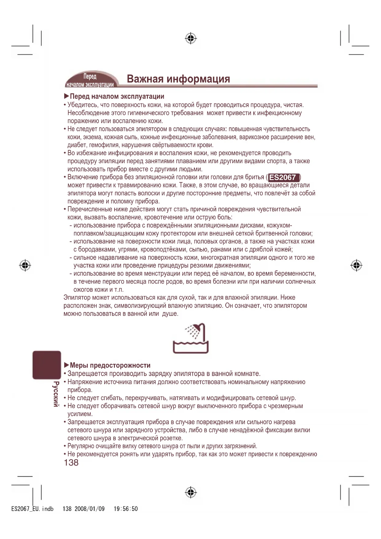 может привести к травмированию кожи. Также, в этом случае, во вращающиеся детали эпилятора могут попасть волоски и другие посторонние предметы, что повлечёт за собой повреждение и поломку прибора. Перечисленные ниже действия могут стать причиной повреждения чувствительной кожи, вызвать воспаление, кровотечение или острую боль: использование прибора с повреждёнными эпиляционными дисками, кожухом- поплавком/защищающим кожу протектором или внешней сеткой бритвенной головки; использование на поверхности кожи лица, половых органов, а также на участках кожи с бородавками, угрями, кровоподтёками, сыпью, ранами или с дряблой кожей; сильное надавливание на поверхность кожи, многократная эпиляции одного и того же участка кожи или проведение прицедуры резкими движениями; использование во время менструации или перед её началом, во время беременности, в течение первого месяца после родов, во время болезни или при наличии солнечных ожогов кожи и т.п. Эпилятор может использоваться как для сухой, так и для влажной эпиляции. Ниже расположен знак, символизирующий влажную эпиляцию. Он означает, что эпилятором можно пользоваться в ванной или душе. Меры предосторожности Запрещается производить зарядку эпилятора в ванной комнате. Напряжение источника питания должно соответствовать номинальному напряжению