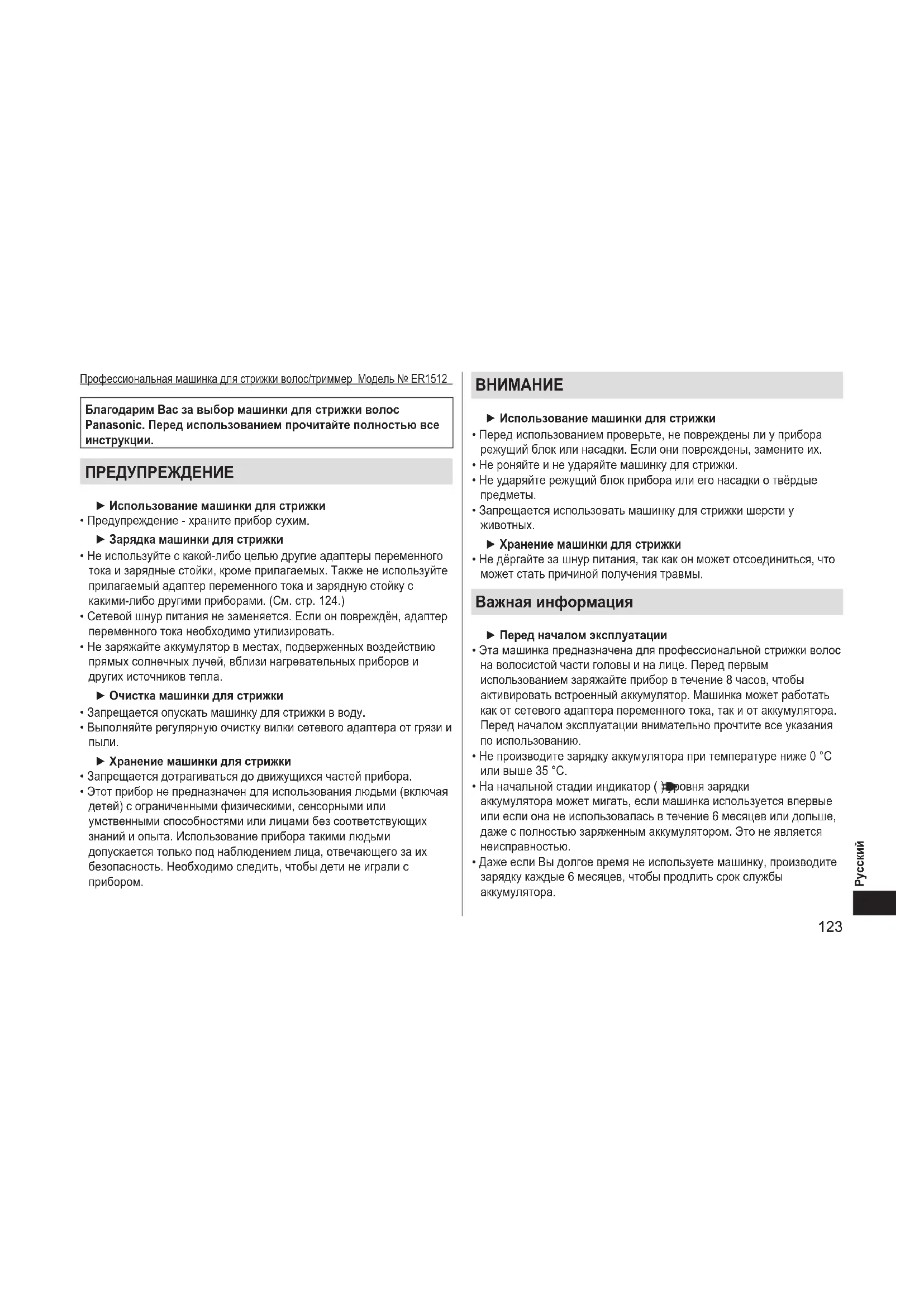 Профессиональная машинка для стрижки волос/триммер Модель № ER1512 БлагодаримВасзавыбормашинкидлястрижкиволос Panasonic.Передиспользованиемпрочитайтеполностьювсе инструкции. ПРЕДУПРЕЖДЕНИЕ ► Использованиемашинкидлястрижки