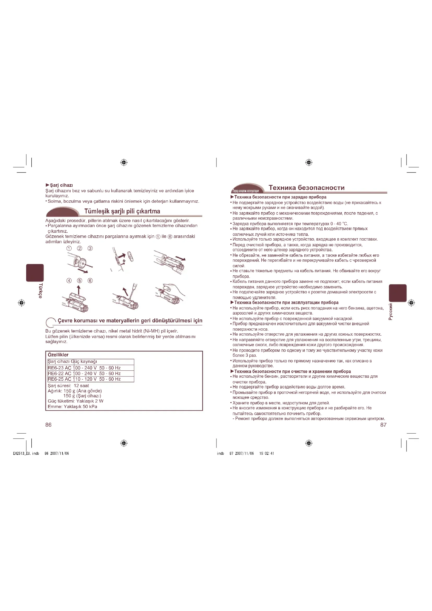 Спецификации Зарядное устройство Питание RE6-23 AC 100 – 240 В 50 - 60 Гц RE6-22 AC 100 – 240 В 50 - 60 Гц RE6-25 AC 110 – 120 В 50 - 60 Гц Время зарядки: 12 часов Вес: 150 г (основной блок) 150 г (зарядное устройство) Потребляемая мощность: Около 2 Вт Сила всасывания: Около 50 кПа