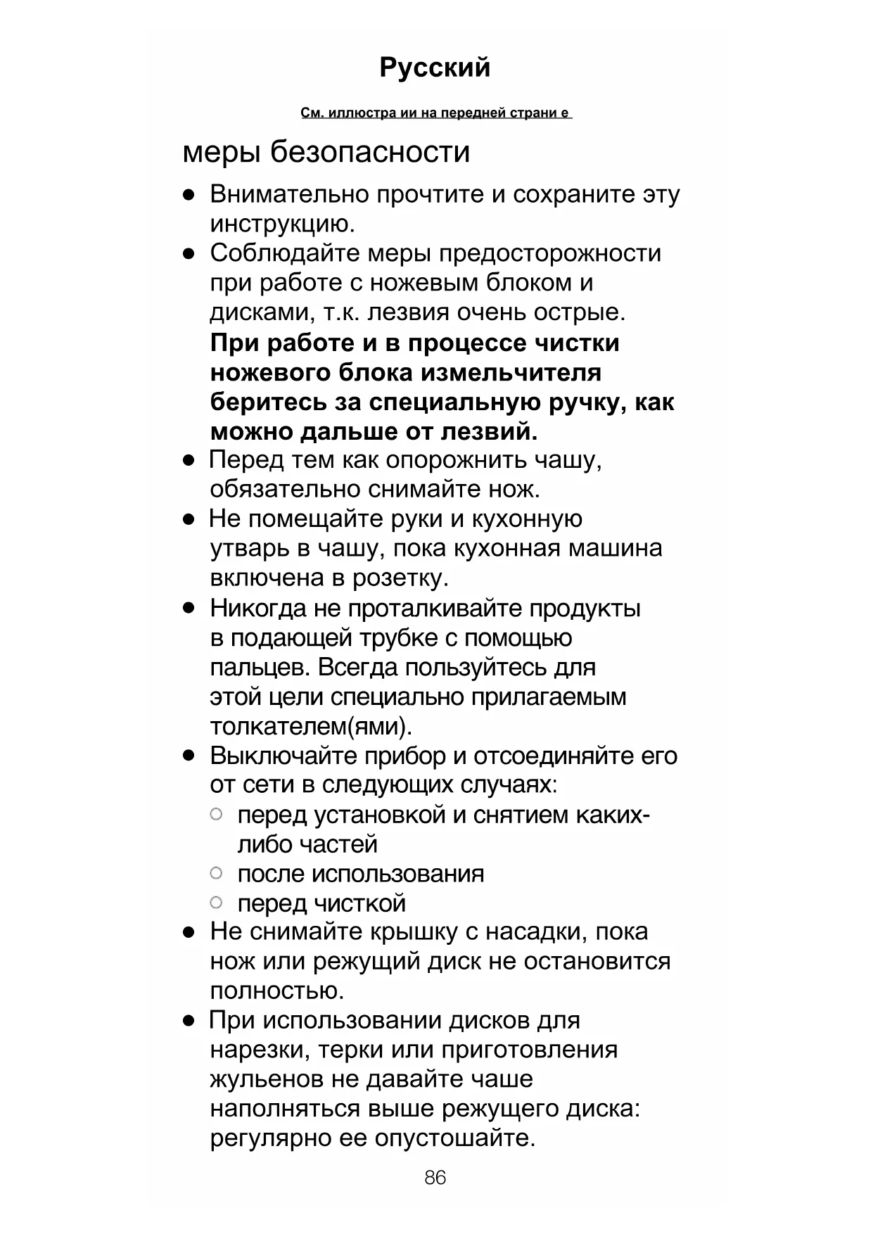 См. иллюстра¯ии на передней страни¯е Русскийl При использовании ножа не наполняйте чашу выше обозначенной максимальной отметки.