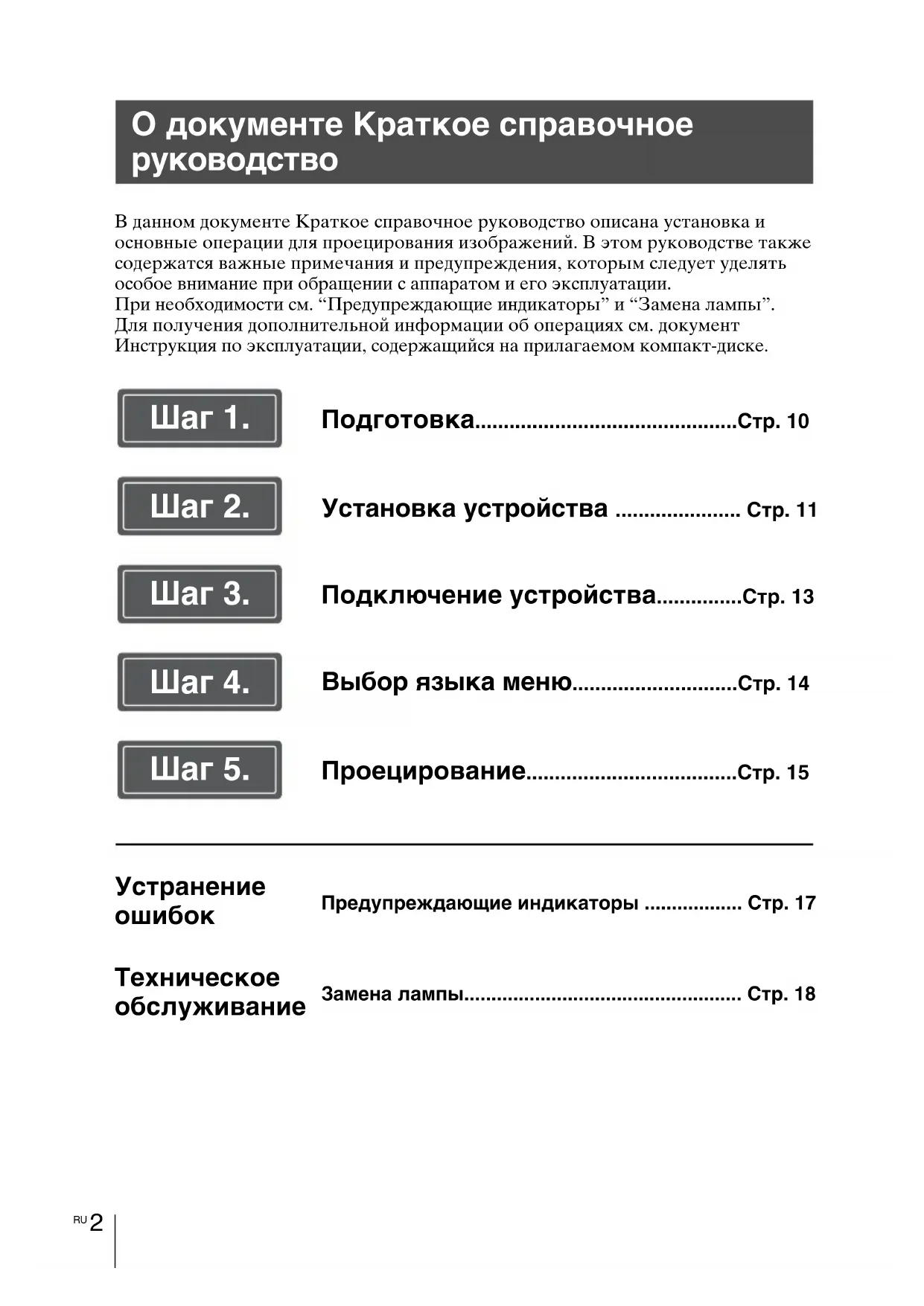 В данном документе Краткое справочное руководство описана установка и основные операции для проецирования изображений. В этом руководстве также содержатся важные примечания и предупреждения, которым следует уделять особое внимание при обращении с аппаратом и его эксплуатации.При необходимости см. “Предупреждающие индикаторы” и “Замена лампы”.Для получения дополнительной информации об операциях см. документ Инструкция по эксплуатации, содержащийся на прилагаемом компакт-диске. О документе Краткое справочное руководство Подготовка..............................................Cтр. 10 Установка устройства ...................... Cтр. 11 Подключение устройства...............Cтр. 13 Выбор языка меню.............................Cтр. 14 Проецирование.....................................Cтр. 15