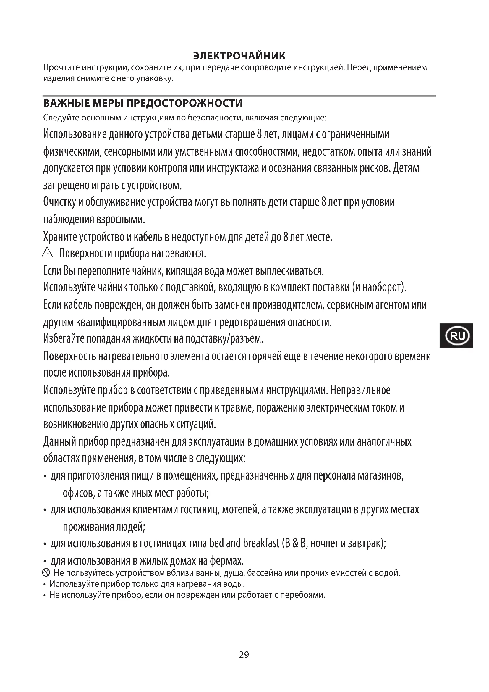 Jotta vältettäisiin vaarallisista aineista ympäristölle ja terveydelle koituvat haitat, näillä symboleilla varustettuja laitteita sekä ladattavia ja kertakäyttöisiä paristoja ei saa hävittää lajittelemattomana sekajätteenä. Hävitä sähkö- ja elektroniikkatuotteet sekä, mikäli sovellettavissa, ladattavat ja kertakäyttöiset paristot asianmukaiseen viralliseen kierrätys-/keräilypisteeseen.29 ЭЛЕКТРОЧАЙНИК Прочтите инструкции, сохраните их, при передаче сопроводите инструкцией. Перед применением изделия снимите с него упаковку. ВАЖНЫЕ МЕРЫ ПРЕДОСТОРОЖНОСТИ Следуйте основным инструкциям по безопасности, включая следующие: Использование данного устройства детьми старше 8 лет, лицами с ограниченными физическими, сенсорными или умственными способностями, недостатком опыта или знаний допускается при условии контроля или инструктажа и осознания связанных рисков. Детям запрещено играть с устройством. Очистку и обслуживание устройства могут выполнять дети старше 8 лет при условии наблюдения взрослыми. Храните устройство и кабель в недоступном для детей до 8 лет месте. h Поверхности прибора нагреваются. Если Вы переполните чайник, кипящая вода может выплескиваться. Используйте чайник только с подставкой, входящую в комплект поставки (и наоборот). Если кабель поврежден, он должен быть заменен производителем, сервисным агентом или другим квалифицированным лицом для предотвращения опасности. Избегайте попадания жидкости на подставку/разъем. Поверхность нагревательного элемента остается горячей еще в течение некоторого времени после использования прибора. Используйте прибор в соответствии с приведенными инструкциями. Неправильное использование прибора может привести к травме, поражению электрическим током и возникновению других опасных ситуаций. Данный прибор предназначен для эксплуатации в домашних условиях или аналогичных областях применения, в том числе в следующих: