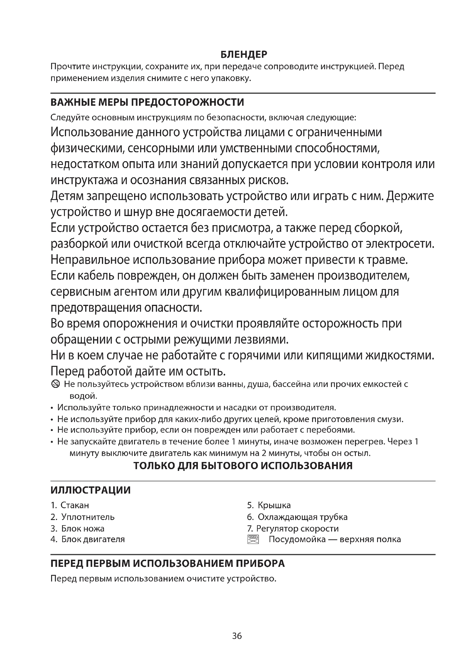 Прочтите инструкции, сохраните их, при передаче сопроводите инструкцией. Перед применением изделия снимите с него упаковку. ВАЖНЫЕ МЕРЫ ПРЕДОСТОРОЖНОСТИ Следуйте основным инструкциям по безопасности, включая следующие: Использование данного устройства лицами с ограниченными физическими, сенсорными или умственными способностями, недостатком опыта или знаний допускается при условии контроля или инструктажа и осознания связанных рисков. Детям запрещено использовать устройство или играть с ним. Держите устройство и шнур вне досягаемости детей. Если устройство остается без присмотра, а также перед сборкой, разборкой или очисткой всегда отключайте устройство от электросети. Неправильное использование прибора может привести к травме. Если кабель поврежден, он должен быть заменен производителем, сервисным агентом или другим квалифицированным лицом для предотвращения опасности. Во время опорожнения и очистки проявляйте осторожность при обращении с острыми режущими лезвиями. Ни в коем случае не работайте с горячими или кипящими жидкостями. Перед работой дайте им остыть. b Не пользуйтесь устройством вблизи ванны, душа, бассейна или прочих емкостей с