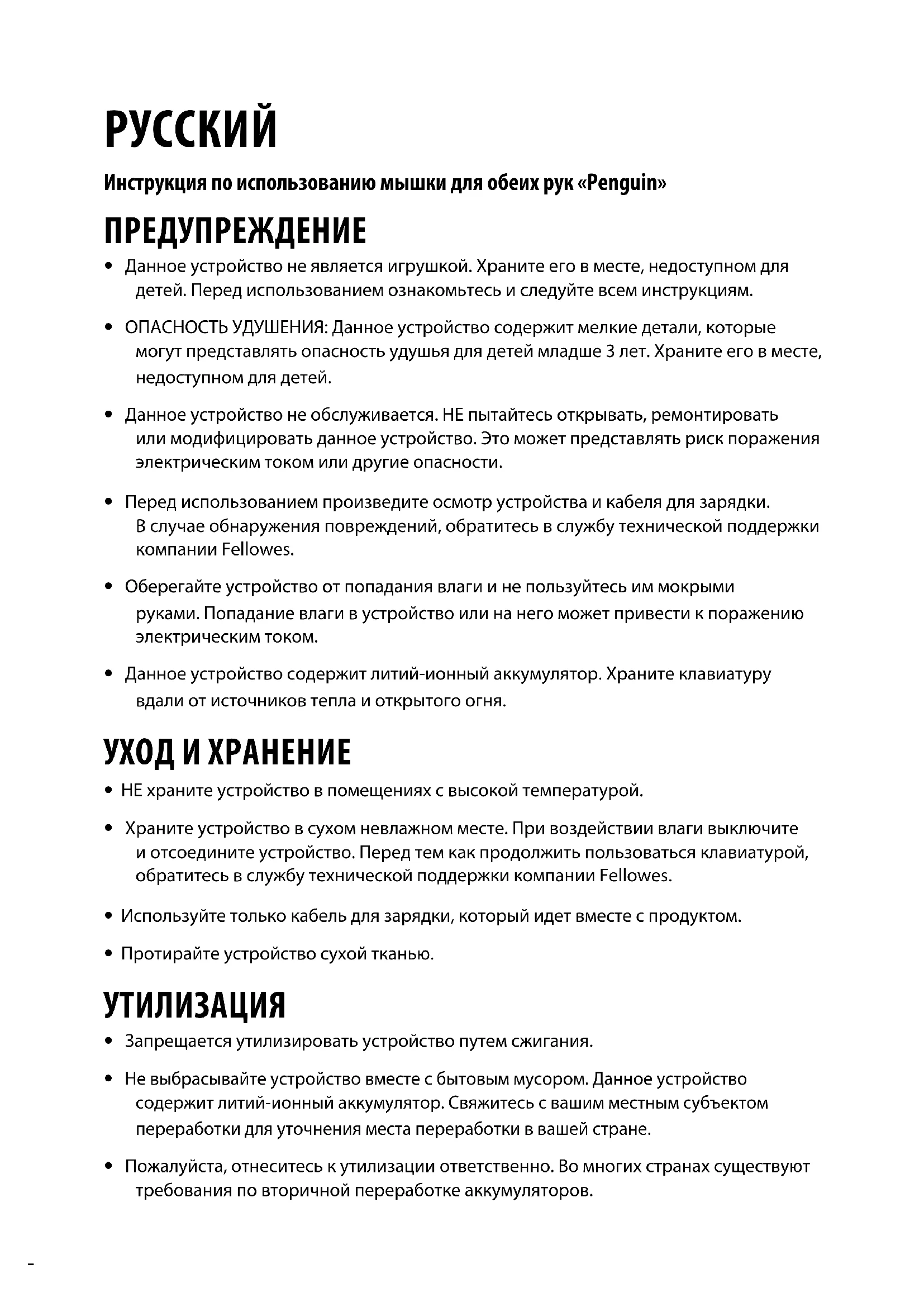 - Попробуйте использовать мышь «Penguin» на другом ПК/ноутбуке, чтобы проверить наличие проблем.ВАЖНАЯ ИНФОРМАЦИЯ Здравоохранение Длительное время работы без регулярных перерывов может вызвать дискомфорт. Если присутствует длительный дискомфорт, обратитесь к квалифицированному врачу. Советы пользователю/Обслуживание Старайтесь не использовать сильнодействующие лечебные крема для рук/ дезинфицирующие средства при использовании мыши «Penguin». Регулярно удаляйте пыль и грязь из-под мыши «Penguin» для обеспечения плавного скольжения. Отказ от ответственности Мы делаем все, чтобы информация и схема в данном руководстве были точными и полными, мы не несем ответственности за любые ошибки или упущения, и мы оставляем за собой право вносить любые изменения без дальнейшего уведомления. Вертикальная мышь для обеих рук «Penguin» компании Fellowes имеет ограниченную гарантию на 2 года Корпорация Fellowes («Компания») гарантирует, что данный в данном продукте не появятся дефекты в материалах и сборке в течение двух (2) лет с даты первичного приобретения продукта. В случае появления таких дефектов в течение срока действия гарантии Компания (по своему усмотрению) выполнит ремонт неисправного устройства или произведет его замену на безоплатной основе или компенсирует покупную стоимость изделия. Компания может потребовать возврат продукта в место, обозначенное Отделом по работе с клиентами за счет покупателя. Настоящая гарантия распространяется только на первоначального розничного покупателя и не распространяется на претензии, возникшие в результате неправильного использования, несоблюдения инструкций по установке и использованию, небрежного использования, использования стороннихкомплектующих, коммерческого использования, использования при напряжении, отличном от указанного на изделии, или несанкционированного обслуживания в течение гарантийного срока на условиях, на которые распространяется гарантия. СРОК ДЕЙСТВИЯ ЛЮБЫХ ПОДРАЗУМЕВАЕМЫХ ГАРАНТИЙ, ВКЛЮЧАЯ, НО НЕ ОГРАНИЧИВАЯСЬ ЛЮБЫМИ ПОДРАЗУМЕВАЕМЫМИ ГАРАНТИЯМИ ТОВАРНОГО СОСТОЯНИЯ ИЛИ ПРИГОДНОСТИ ДЛЯ ОПРЕДЕЛЕННОЙ ЦЕЛИ, ЧЕТКО ОГРАНИЧЕН СРОКОМ ДЕЙСТВИЯ ДАННЫХ ГАРАНТИЙНЫХ УСЛОВИЙ. ЕСЛИ ИНОЕ НЕ ПРЕДПИСАНО ЗАКОНОМ, ИСКЛЮЧИТЕЛЬНОЕ СРЕДСТВО ПРАВОВОЙ ЗАЩИТЫ ПОКУПАТЕЛЯ В СЛУЧАЕ НАРУШЕНИЯ ДАННЫХ ГАРАНТИЙНЫХ УСЛОВИЙ ИЛИ ПОДРАЗУМЕВАЕМЫХ ГАРАНТИЙНЫХ УСЛОВИЙ, ЛИБО ЛЮБЫХ ДРУГИХ ОБЯЗАТЕЛЬСТВ, ВЫТЕКАЮЩИХ ИЗ ДЕЙСТВУЮЩЕГО ЗАКОНОДАТЕЛЬСТВА, ОГРАНИЧИВАЕТСЯ УКАЗАННЫМ ЗДЕСЬ ПРАВОМ НА РЕМОНТ, ЗАМЕНУ УСТРОЙСТВА ИЛИ КОМПЕНСАЦИЮ ЕГО ПОКУПНОЙ СТОИМОСТИ, НА УСМОТРЕНИЕ КОМПАНИИ. НИ ПРИ КАКИХ ОБСТОЯТЕЛЬСТВАХ КОМПАНИЯ, ЕЕ ФИЛИАЛЫ, ДОЧЕРНИЕ ПРЕДПРИЯТИЯ, РОДСТВЕННЫЕ КОМПАНИИ, РЕСЕЛЛЕРЫ ИЛИ ИХ УПОЛНОМОЧЕННЫЕ ПРЕДСТАВИТЕЛИ, ДИРЕКТОРА, СЛУЖАЩИЕ ИЛИ ЛИЦА, ЗА КОТОРЫХ ОНИ НЕСУТ ОТВЕТСТВЕННОСТЬ ПО ЗАКОНУ, НЕ НЕСУТ ОТВЕТСТВЕННОСТИ ЗА КОСВЕННЫЕ ИЛИ СЛУЧАЙНЫЕ УБЫТКИ, ВОЗНИКШИЕ В СВЯЗИ С ПРОДУКТОМ. КОМПАНИЯ И ДРУГИЕ УПОМЯНУТЫЕ ЗДЕСЬ СТОРОНЫ НЕ УПОЛНОМОЧИВАЮТ НИКАКИХ СВОИХ ПРЕДСТАВИТЕЛЕЙ ИЛИ ДРУГИХ ЛИЦ БРАТЬ НА СЕБЯ КАКИЕ-ЛИБО ОБЯЗАТЕЛЬСТВА ИЛИ ОТВЕТСТВЕННОСТЬ, КРОМЕ ТЕХ, КОТОРЫЕ ЧЕТКО ИЗЛОЖЕНЫ В ДАННОМ ДОКУМЕНТЕ. Сроки и условия действия данной гарантии действительны для всех стран, кроме тех, в которых законом налагаются иные ограничения и условия.АНТИМИКРОБНАЯ ЗАЩИТА BioCote® - бренд антимикробной защиты, котор