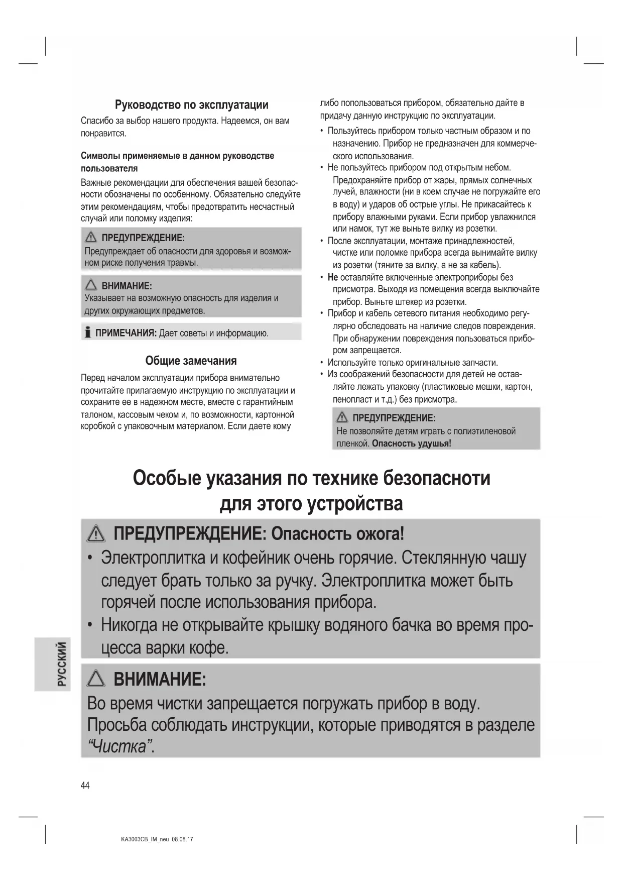 Во время чистки запрещается погружать прибор в воду. Просьба соблюдать инструкции, которые приводятся в разделе “Чистка”.45 KA3003CB_IM_neu 08.08.17
