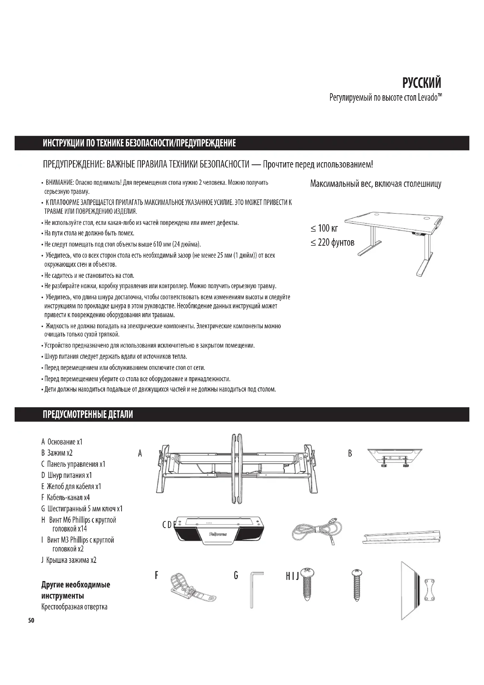 Регулируемый по высоте стол Levado™ ИНСТРУКЦИИ ПО ТЕХНИКЕ БЕЗОПАСНОСТИ/ПРЕДУПРЕЖДЕНИЕ ПРЕДУСМОТРЕННЫЕ ДЕТАЛИ ПРЕДУПРЕЖДЕНИЕ: ВАЖНЫЕ ПРАВИЛА ТЕХНИКИ БЕЗОПАСНОСТИ — Прочтите перед использованием! ≤ 220 фунтов Максимальный вес, включая столешницу ≤ 100 кг A Основание x1 B Зажим x2 C Панель управления x1 D Шнур питания x1 E Желоб для кабеля x1 F Кабель-канал x4 G Шестигранный 5 мм ключ x1 H Винт M6 Phillips с круглой головкой x14 I Винт M3 Phillips с круглой головкой x2 J Крышка зажима x2 Другие необходимые инструменты Крестообразная отвертка
