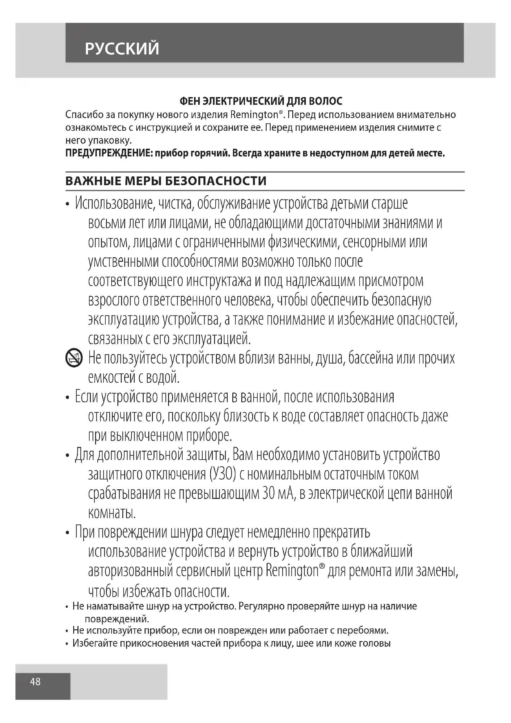 AE48 ФЕН ЭЛЕКТРИЧЕСКИЙ ДЛЯ ВОЛОС Спасибо за покупку нового изделия Remington®. Перед использованием внимательно ознакомьтесь с инструкцией и сохраните ее. Перед применением изделия снимите с него упаковку. ПРЕДУПРЕЖДЕНИЕ: прибор горячий. Всегда храните в недоступном для детей месте. ВАЖНЫЕ МЕРЫ БЕЗОПАСНОСТИ