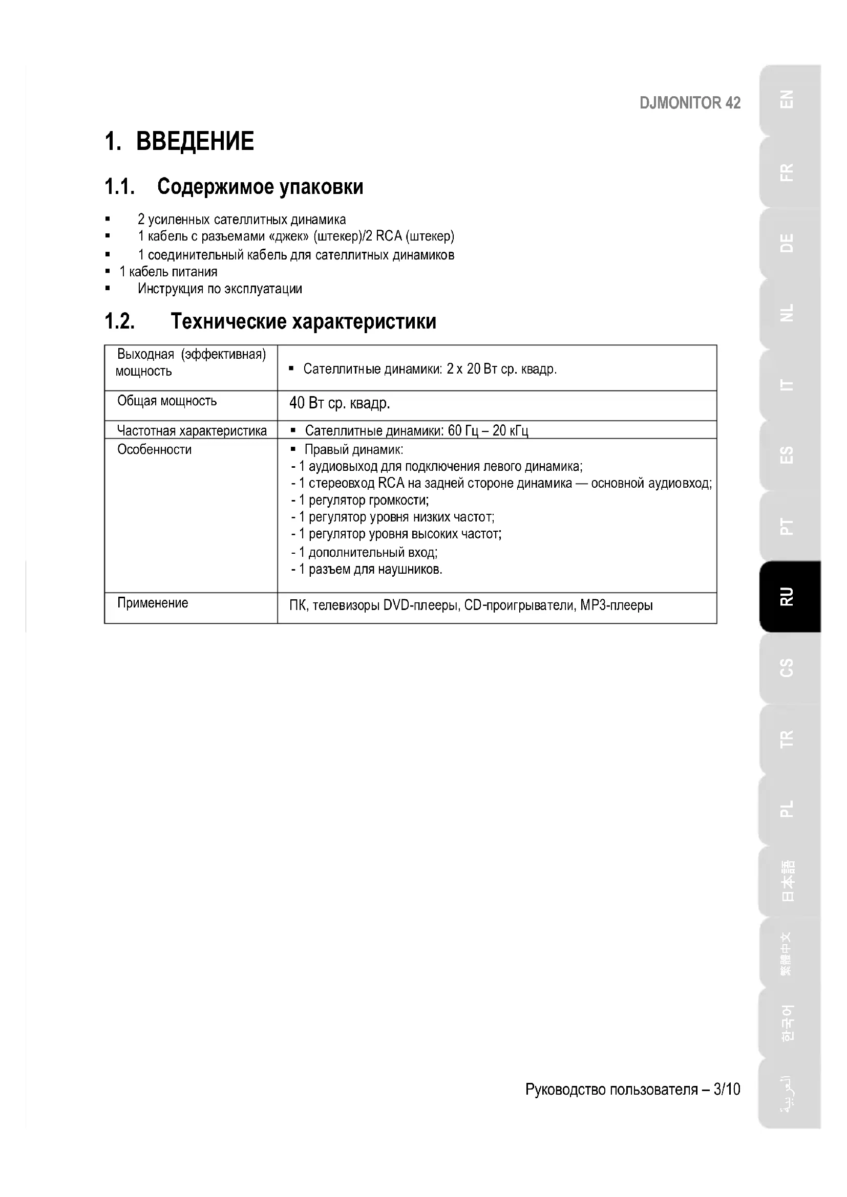 1.1. Содержимое упаковки 2 усиленных сателлитных динамика 1 кабель с разъемами «джек» (штекер)/2 RCA (штекер) 1 соединительный кабель для сателлитных динамиков 1 кабель питания Инструкция по эксплуатации 1.2. Технические характеристики Выходная (эффективная)