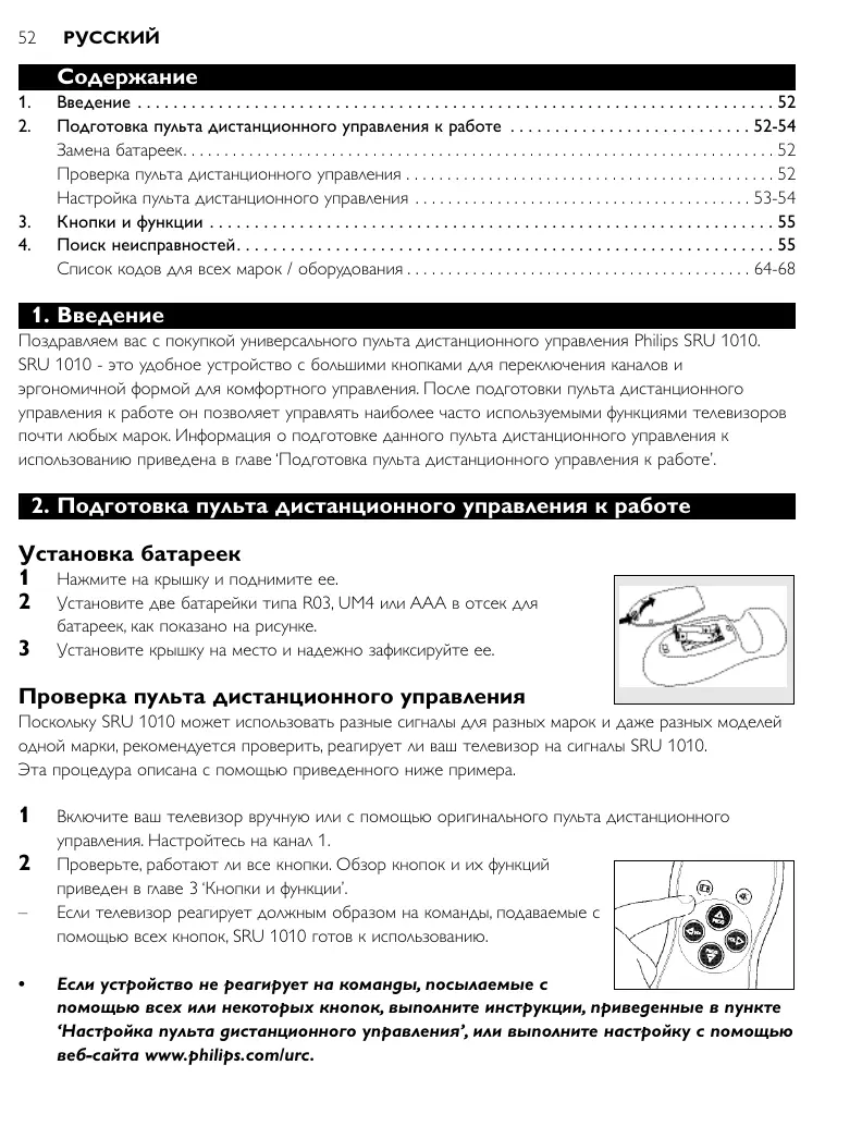 Введение . . . . . . . . . . . . . . . . . . . . . . . . . . . . . . . . . . . . . . . . . . . . . . . . . . . . . . . . . . . . . . . . . . . . . . . 52 Подготовка пульта дистанционного управления к работе . . . . . . . . . . . . . . . . . . . . . . . . . . . 52-54 Замена батареек. . . . . . . . . . . . . . . . . . . . . . . . . . . . . . . . . . . . . . . . . . . . . . . . . . . . . . . . . . . . . . . . . . . . . . . . 52 Проверка пульта дистанционного управления . . . . . . . . . . . . . . . . . . . . . . . . . . . . . . . . . . . . . . . . . . . . . 52 Настройка пульта дистанционного управления . . . . . . . . . . . . . . . . . . . . . . . . . . . . . . . . . . . . . . . . . 53-54 Кнопки и функции . . . . . . . . . . . . . . . . . . . . . . . . . . . . . . . . . . . . . . . . . . . . . . . . . . . . . . . . . . . . . . . 55 Поиск неисправностей. . . . . . . . . . . . . . . . . . . . . . . . . . . . . . . . . . . . . . . . . . . . . . . . . . . . . . . . . . . . 55 Список кодов для всех марок / оборудования . . . . . . . . . . . . . . . . . . . . . . . . . . . . . . . . . . . . . . . . . . 64-68