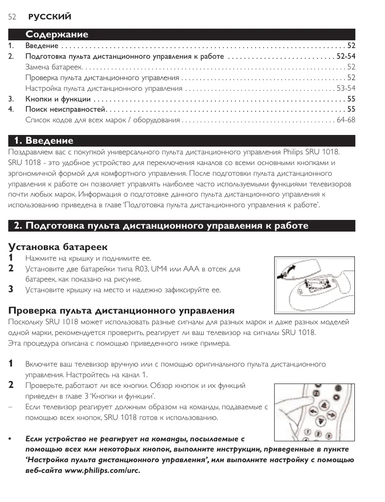 Поздравляем вас с покупкой универсального пульта дистанционного управления Philips SRU 1018. SRU 1018 - это удобное устройство для переключения каналов со всеми основными кнопками и эргономичной формой для комфортного управления. После подготовки пульта дистанционного управления к работе он позволяет управлять наиболее часто используемыми функциями телевизоров почти любых марок. Информация о подготовке данного пульта дистанционного управления к использованию приведена в главе ‘Подготовка пульта дистанционного управления к работе’.