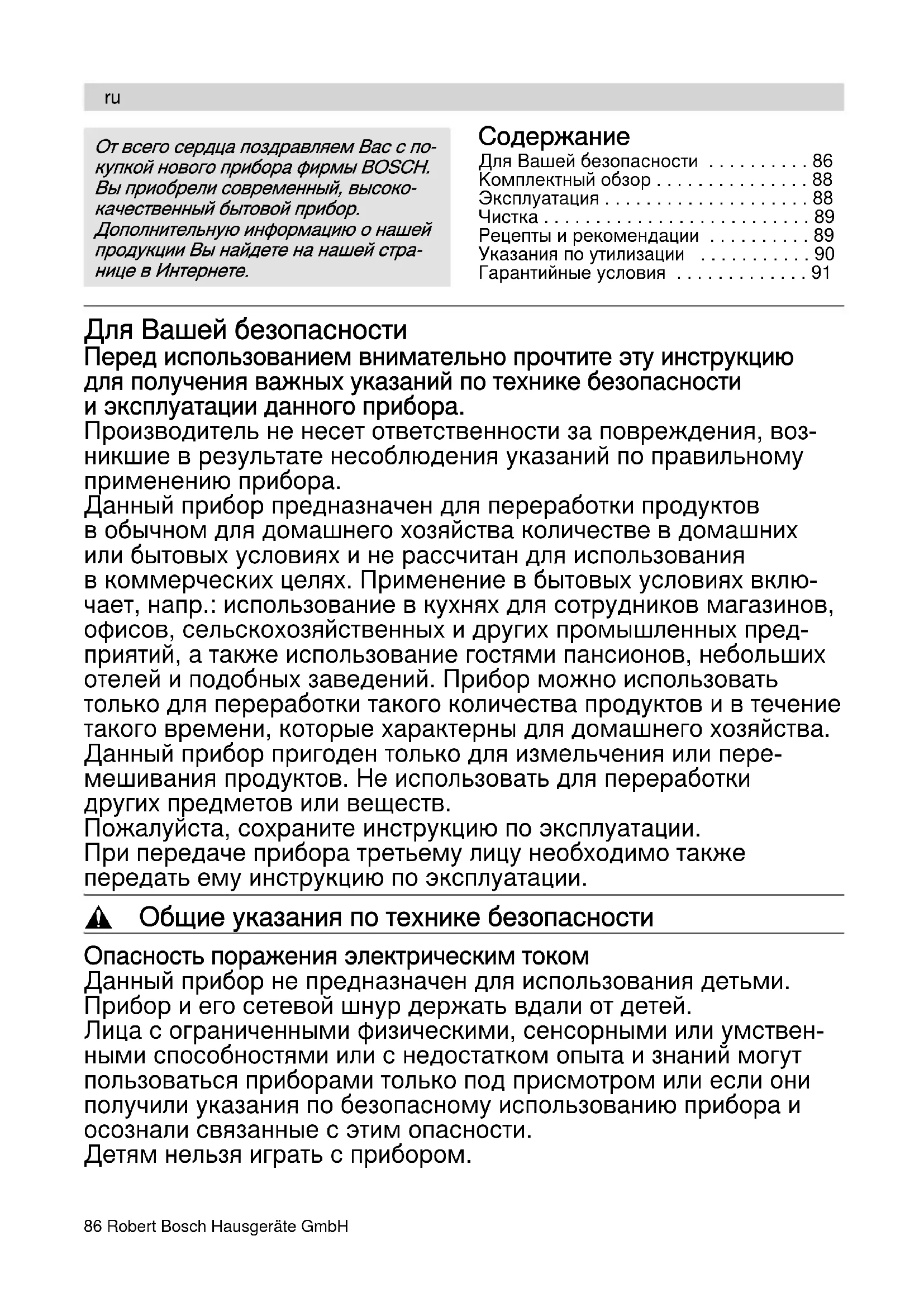 - Гарантийные условия Для Вашей безопасности Перед использованием внимательно прочтите эту инструкцию для получения важных указаний по технике безопасности и эксплуатации данного прибора. Производитель не несет ответственности за повреждения, воз- никшие в результате несоблюдения указаний по правильному применению прибора. Данный прибор предназначен для переработки продуктов в обычном для домашнего хозяйства количестве в домашних или бытовых условиях и не рассчитан для использования в коммерческих целях. Применение в бытовых условиях вклю- чает, напр.: использование в кухнях для сотрудников магазинов, офисов, сельскохозяйственных и других промышленных пред- приятий, а также использование гостями пансионов, небольших отелей и подобных заведений. Прибор можно использовать только для переработки такого количества продуктов и в течение такого времени, которые характерны для домашнего хозяйства. Данный прибор пригоден только для измельчения или пере- мешивания продуктов. Hе использовать для переработки других предметов или веществ. Пожалуйста, сохраните инструкцию по эксплуатации. При передаче прибора третьему лицу необходимо также передать ему инструкцию по эксплуатации. , Общие указания по технике безопасности Опасность поражения электрическим током Данный прибор не предназначен для использования детьми. Прибор и его сетевой шнур держать вдали от детей. Лица с ограниченными физическими, сенсорными или умствен- ными способностями или с недостатком опыта и знаний могут пользоваться приборами только под присмотром или если они получили указания по безопасному использованию прибора и осознали связанные с этим опасности. Детям нельзя играть с прибором. p. 91