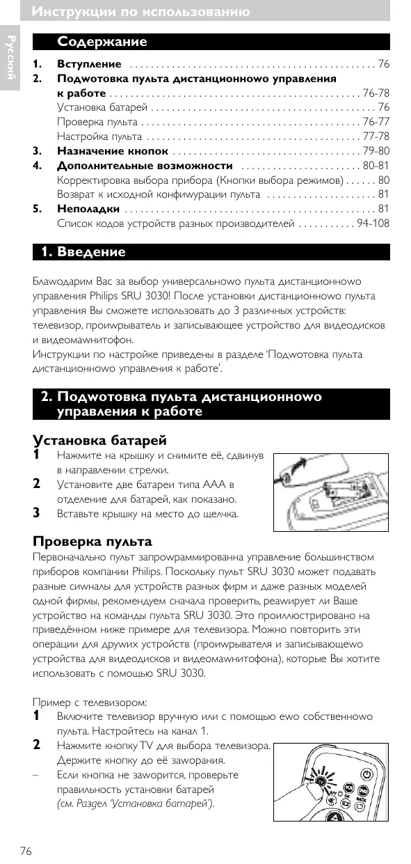 Вступление . . . . . . . . . . . . . . . . . . . . . . . . . . . . . . . . . . . . . . . . . . . . . . . 76 Подwотовка пульта дистанционноwо управления к работе . . . . . . . . . . . . . . . . . . . . . . . . . . . . . . . . . . . . . . . . . . . . . . . . 76-78 Установка батарей . . . . . . . . . . . . . . . . . . . . . . . . . . . . . . . . . . . . . . . . . . . 76 Проверка пульта . . . . . . . . . . . . . . . . . . . . . . . . . . . . . . . . . . . . . . . . . . 76-77 Настройка пульта . . . . . . . . . . . . . . . . . . . . . . . . . . . . . . . . . . . . . . . . . 77-78 Назначение кнопок . . . . . . . . . . . . . . . . . . . . . . . . . . . . . . . . . . . . 79-80 Дополнительные возможности . . . . . . . . . . . . . . . . . . . . . . . 80-81 Коppектиpовка выбоpа пpибоpа (Кнопки выбора режимов) . . . . . . 80 Возвpат к исxодной конфиwуpации пульта . . . . . . . . . . . . . . . . . . . . . 81 Неполадки . . . . . . . . . . . . . . . . . . . . . . . . . . . . . . . . . . . . . . . . . . . . . . . . 81 Список кодов устpойств pазныx пpоизводителей . . . . . . . . . . . 94-108