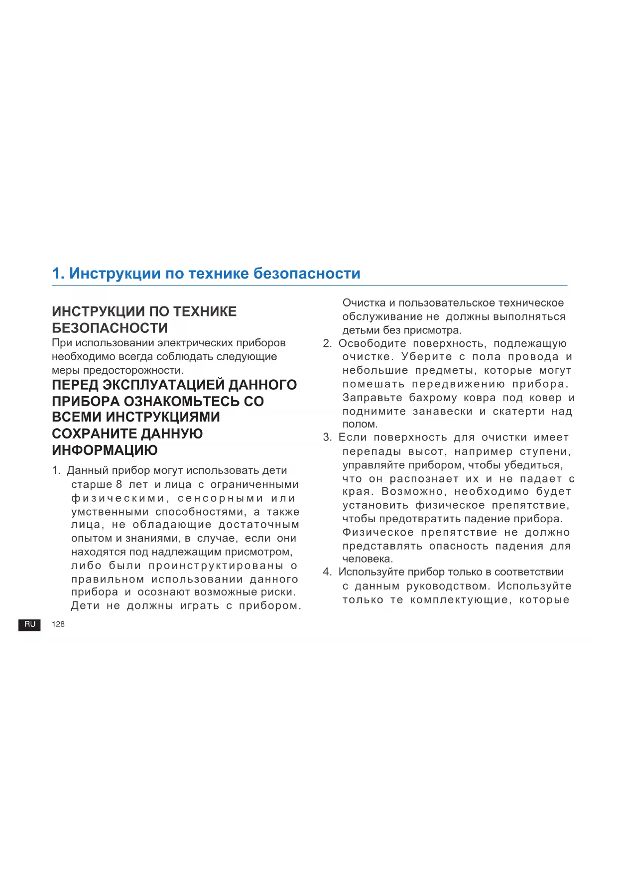 1 Данный прибор могут использовать дети старше 8 лет и лица с ограниченными физическими, сенсорными или умственными способностями, а также лица, не обладающие достаточным опытом и знаниями, в случае, если они находятся под надлежащим присмотром, либо были проинструктированы о правильном использовании данного прибора и осознают возможные риски. Дети не должны играть с прибором. Очистка и пользовательское техническое обслуживание не должны выполняться детьми без присмотра. 2 Освободите поверхность, подлежащую очистке. Уберите с пола провода и небольшие предметы, которые могут помешать передвижению прибора. Заправьте бахрому ковра под ковер и поднимите занавески и скатерти над