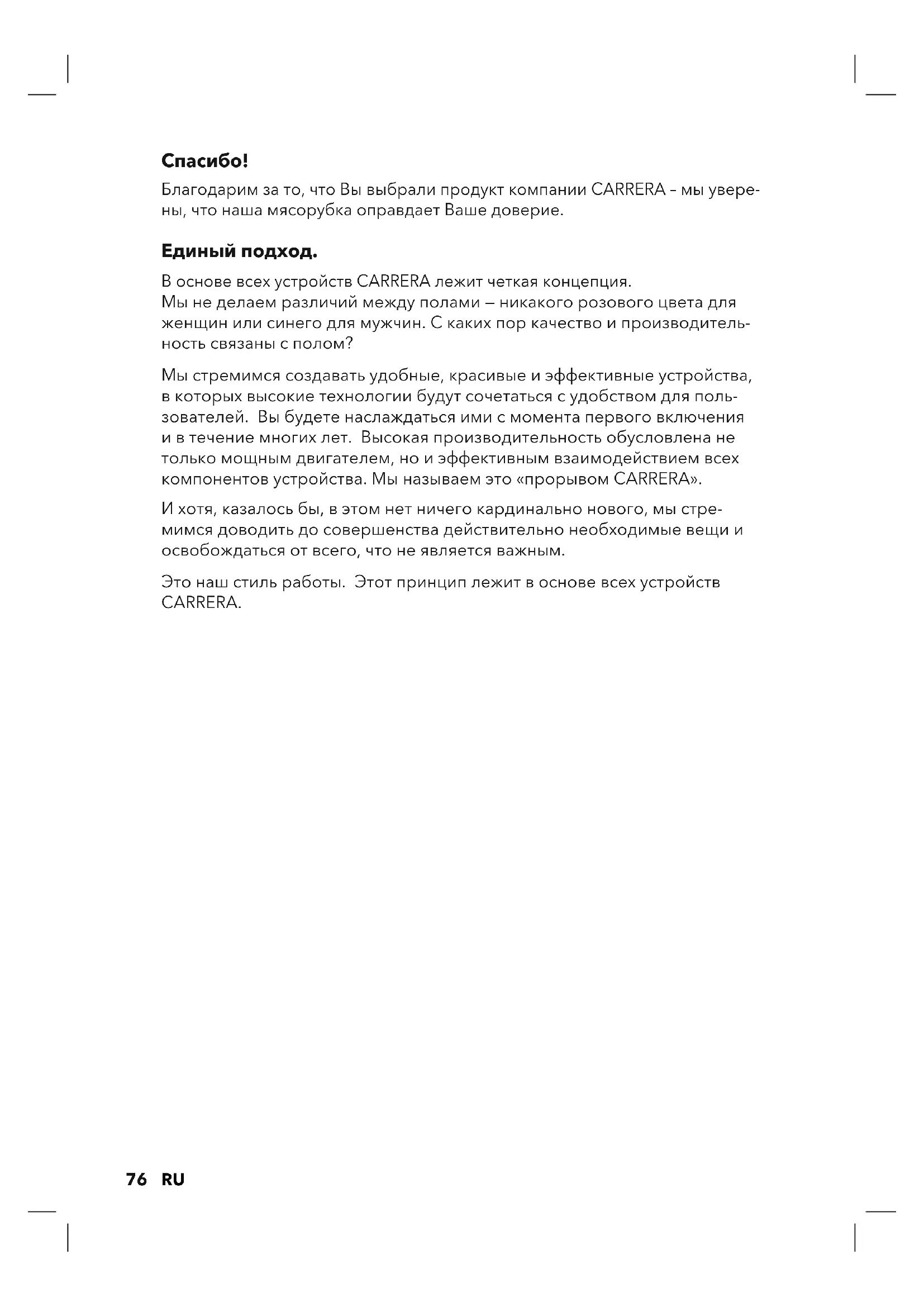 Благодарим за то, что Вы выбрали продукт компании CARRERA – мы увере- ны, что наша мясорубка оправдает Ваше доверие. Единый подход. В основе всех устройств CARRERA лежит четкая концепция. Мы не делаем различий между полами— никакого розового цвета для женщин или синего для мужчин. С каких пор качество и производитель- ность связаны с полом? Мы стремимся создавать удобные, красивые и эффективные устройства, в которых высокие технологии будут сочетаться с удобством для поль- зователей. Вы будете наслаждаться ими с момента первого включения и в течение многих лет. Высокая производительность обусловлена не только мощным двигателем, но и эффективным взаимодействием всех компонентов устройства. Мы называем это «прорывом CARRERA». И хотя, казалось бы, в этом нет ничего кардинально нового, мы стре- мимся доводить до совершенства действительно необходимые вещи и освобождаться от всего, что не является важным. Это наш стиль работы. Этот принцип лежит в основе всех устройств CARRERA.77
