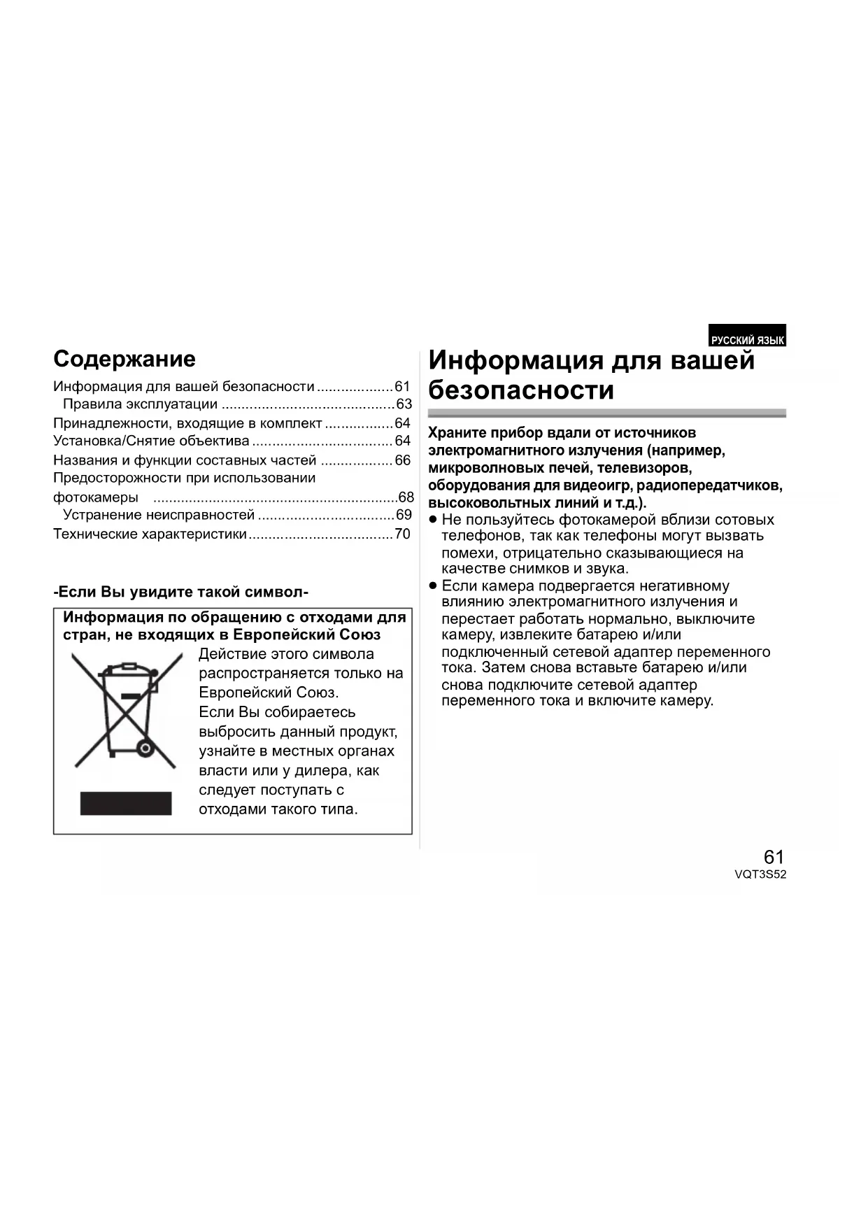 переменного тока и включите камеру. Информация по обращению с отходами для стран, не входящих в Европейский Союз Действие этого символа распространяется только на Европейский Союз. Если Вы собираетесь выбросить данный продукт, узнайте в местных органах власти или у дилера, как следует поступать с отходами такого типа. РУССКИЙ ЯЗЫК VQT3S52_E.book 61 ページ 2011年9月12日 月曜日 午後1時38分62 VQT3S52 Объектив может использоваться с цифровой камерой, совместимой со стандартом крепления объективов “Micro Four Thirds
