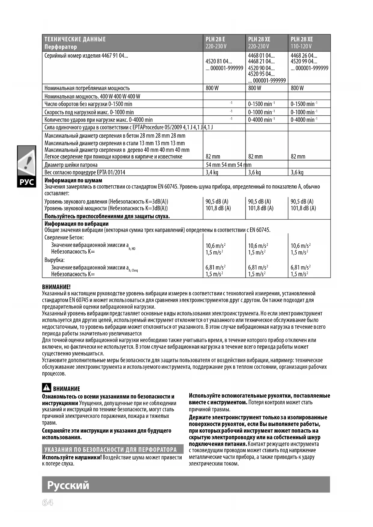 Сила одиночного удара в соответствии с EPTAProcedure 05/2009 4,1 J 4,1 J 4,1 J Максимальный диаметр сверления в бетон 28 mm 28 mm 28 mm Максимальный диаметр сверления в стали 13 mm 13 mm 13 mm Максимальный диаметр сверления в дерево 40 mm 40 mm 40 mm Легкое сверление при помощи коронкив кирпиче и известняке 82 mm 82 mm 82 mm Диаметр шейки патрона 54 mm 54 mm 54 mm Вес согласно процедуре EPTA 01/2014 3,4 kg 3,6 kg 3,6 kg Информация по шумам Значения замерялись в соответствии со стандартом EN 60745. Уровень шума прибора, определенный по показателю А, обычно составляет: Уровень звукового давления (Небезопасность K=3dB(A)) Уровень звуковой мощности (Небезопасность K=3dB(A)) 90,5 dB (A) 101,8 dB (A) 90,5 dB (A) 101,8 dB (A) 90,5 dB (A) 101,8 dB (A) Пользуйтесь приспособлениями для защиты слуха. Информация по вибрации Общие значения вибрации (векторная сумма трех направлений) определены в соответствии с EN 60745. Сверление Бетон: Значение вибрационной эмиссии a h, HD Небезопасность K= 10,6 m/s