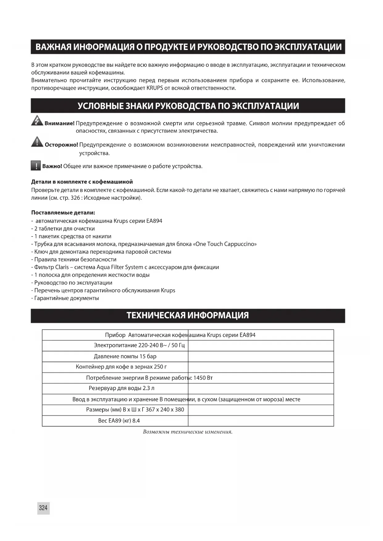 Важно! Общее или важное примечание о работе устройства. Детали в комплекте с кофемашиной Проверьте детали в комплекте с кофемашиной. Если какой-то детали не хватает, свяжитесь с нами напрямую по горячей линии (см. стр. 326 : Исходные настройки). Поставляемые детали: - автоматическая кофемашина Krups серии EA894 - 2 таблетки для очистки - 1 пакетик средства от накипи - Трубка для всасывания молока, предназначаемая для блока «One Touch Cappuccino» - Ключ для демонтажа переходника паровой системы - Правила техники безопасности - Фильтр Claris – система Aqua Filter System с аксессуаром для фиксации - 1 полоска для определения жесткости воды - Руководство по эксплуатации - Перечень центров гарантийного обслуживания Krups - Гарантийные документы ТЕХНИЧЕСКАЯ ИНФОРМАЦИЯ Прибор Автоматическая кофемашина Krups серии EA894 Электропитание 220-240 В~ / 50 Гц Давление помпы 15 бар Контейнер для кофе в зернах 250 г Потребление энергии В режиме работы: 1450 Вт Резервуар для воды 2.3 л Ввод в эксплуатацию и хранение В помещении, в сухом (защищенном от мороза) месте Размеры (мм) В x Ш x Г 367 x 240 x 380 Вес EA89 (кг) 8.4 Возможны технические изменения. 324ОПИСАНИЕ УСТРОЙСТВА A Ручка/крышка резервуара для водыB Резервуар для водыC Контейнер для кофейной гущиD Регулируемые по высоте сопла для подачи кофеE Решетка и съемный поддон для сбора капельF Крышка контейнера для зеренG Съемный блок One Touch CappuccinoG1 Ключ-съемник для очистки парового контураG2 Блок One touch cappuccinoH Трубка всасывания молока и переходникI Поплавок, показывающий уровень воды Контейнер для зеренJ Рукоятка регулировки степени помолаK Отверстие для помещения таблетки для очисткиL Металлическая кофемолка Панель управленияM OLED-дисплейN Кнопка включения/выключенияO Сенсорные кнопкиПодробная информация:Поддон для сбора капель накапливает воду или кофе, капающие из устройства во время или после приготовления напитка. Не снимайте поддон и регулярно опустошайте его по мере наполнения.