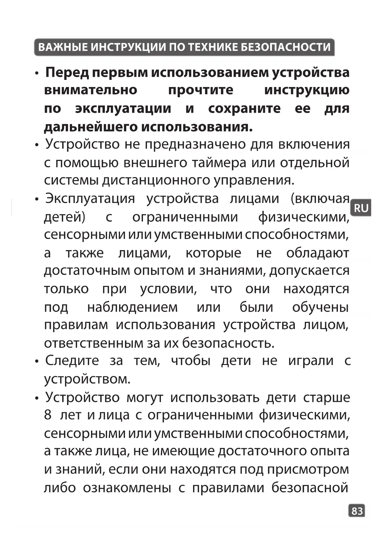 - Устройство могут использовать дети старше 8 лет илица с ограниченными физическими, сенсорными или умственными способностями, а также лица, не имеющие достаточного опыта и знаний, если они находятся под присмотром либо ознакомлены с правилами безопасной84 эксплуатации устройства и осознают связанные с ним опасности. Очистка и обслуживание устройства могут выполняться детьми старше 8 лет под присмотром взрослых.