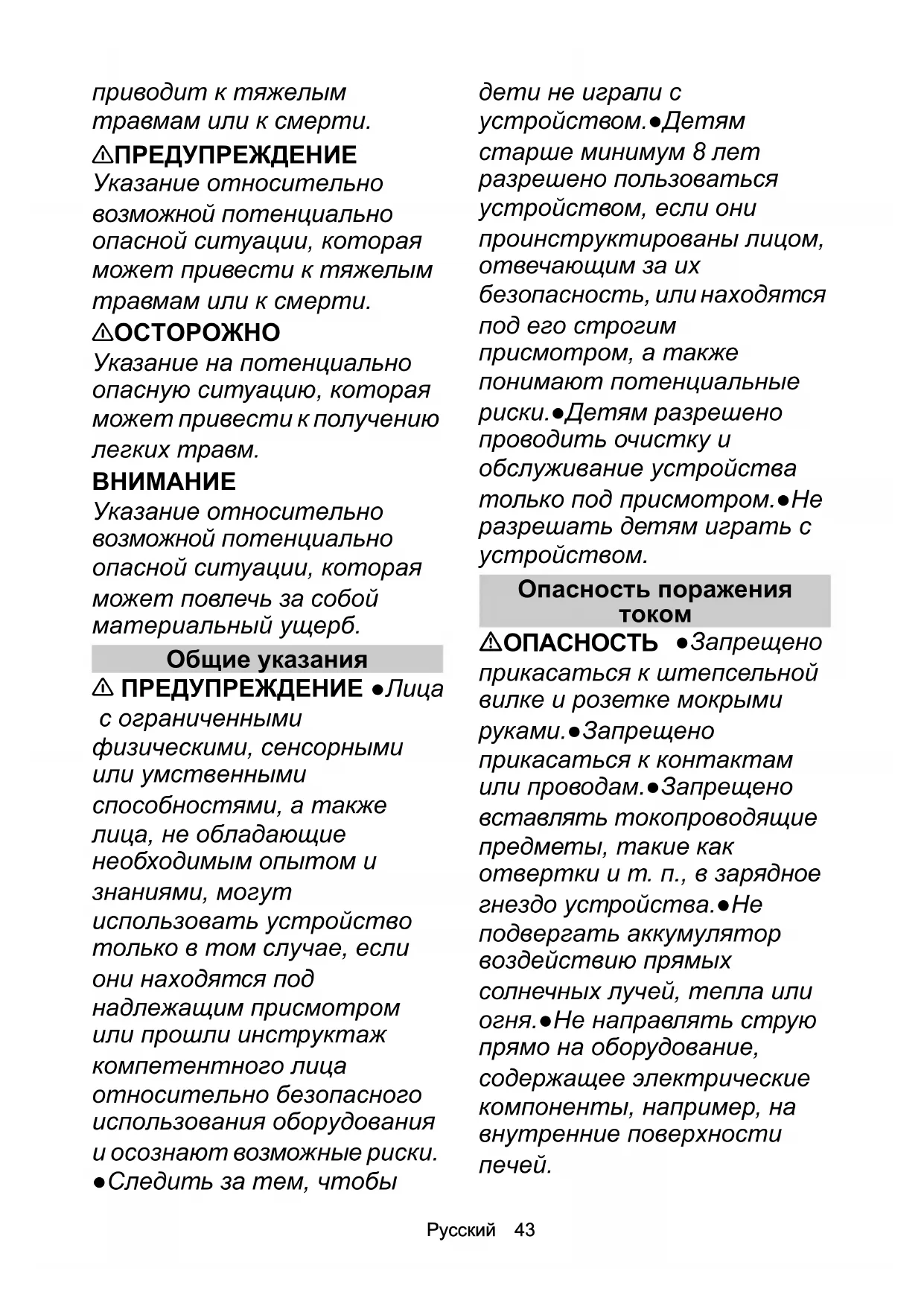 ПРЕДУПРЕЖДЕНИЕ ●Лица с ограниченными физическими, сенсорными или умственными способностями, а также лица, не обладающие необходимым опытом и знаниями, могут использовать устройство только в том случае, если они находятся под надлежащим присмотром или прошли инструктаж компетентного лица относительно безопасного использования оборудования и осознают возможные риски. ●Следить за тем, чтобы дети не играли с устройством.●Детям старше минимум 8 лет разрешено пользоваться устройством, если они проинструктированы лицом, отвечающим за их безопасность, или находятся под его строгим присмотром, а также понимают потенциальные риски.●Детям разрешено проводить очистку и обслуживание устройства только под присмотром.●Не разрешать детям играть с устройством. Опасность поражения