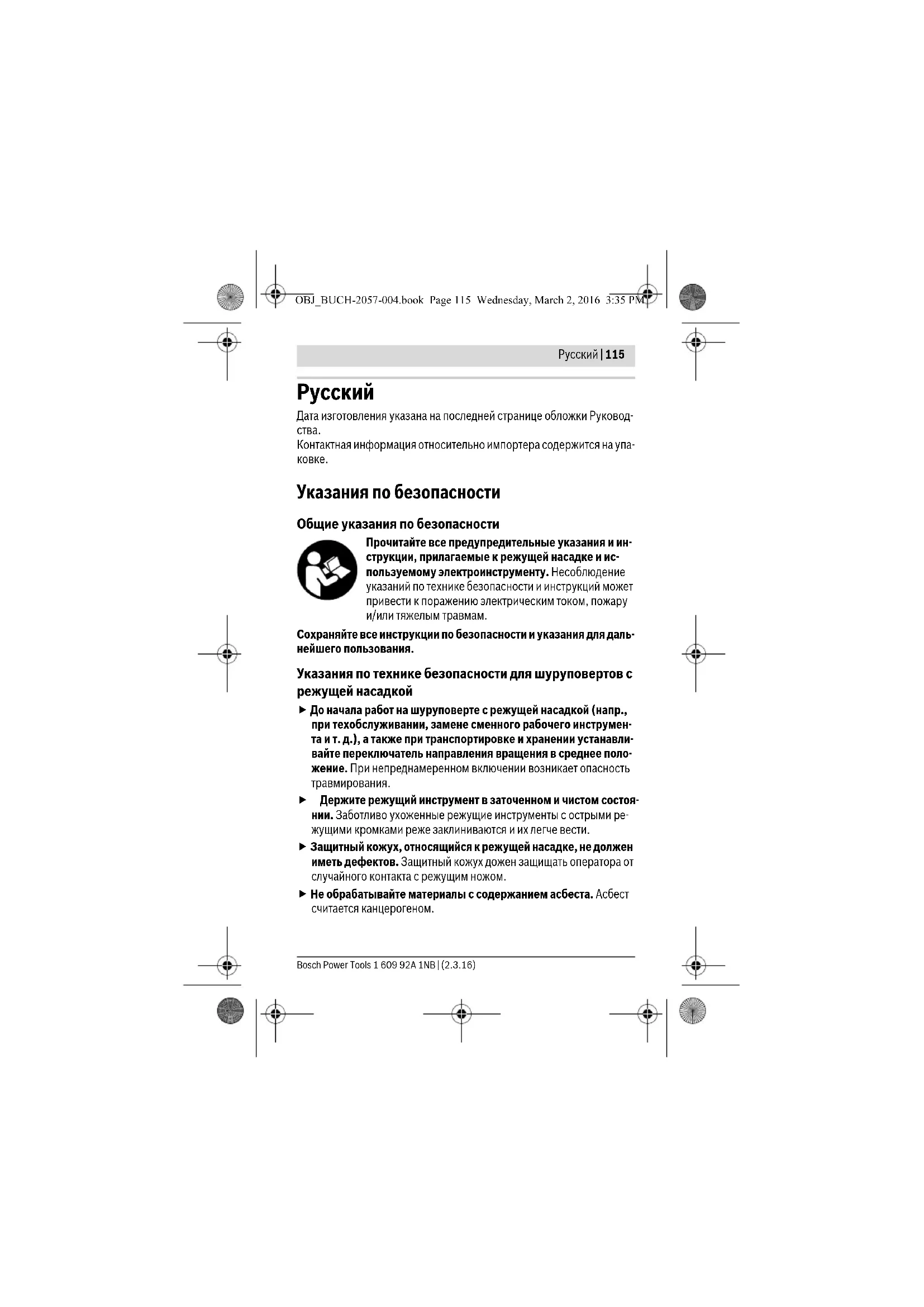Для региона: Россия, Беларусь, Казахстан, Украина Гарантийное обслуживание и ремонт электроинструмента, с соблю- дением требований и норм изготовителя производятся на террито- рии всех стран только в фирменных или авторизованных сервисных центрах «Роберт Бош». ПРЕДУПРЕЖДЕНИЕ! Использование контрафактной продукции опа- сно в эксплуатации, может привести к ущербу для Вашего здоровья. Изготовление и распространение контрафактной продукции пресле- дуется по Закону в административном и уголовном порядке. OBJ_BUCH-2057-004.book Page 120 Wednesday, March 2, 2016 3:35 PMРусский | 121 Bosch Power Tools 1 609 92A 1NB | (2.3.16)