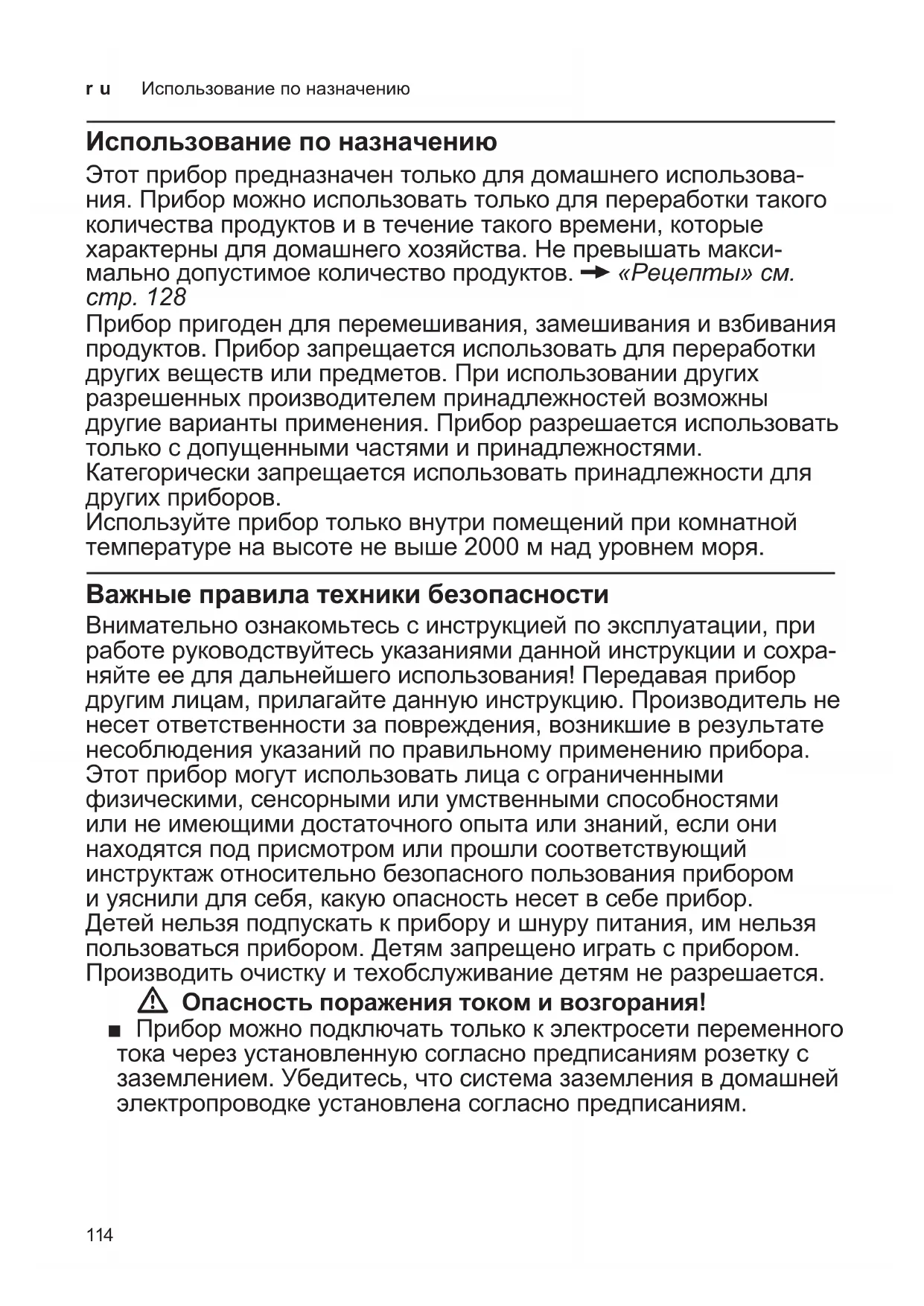 ■ Підніміть і знову поставте прилад. ■ Скиньте конфігурацію ваг і повторіть спробу.114 ru Использование по назначению Использование по назначению Этот прибор предназначен только для домашнего использова- ния. Прибор можно использовать только для переработки такого количества продуктов и в течение такого времени, которые характерны для домашнего хозяйства. Не превышать макси- мально допустимое количество продуктов. X«Рецепты»см. стр.128 Прибор пригоден для перемешивания, замешивания и взбивания продуктов. Прибор запрещается использовать для переработки других веществ или предметов. При использовании других разрешенных производителем принадлежностей возможны другие варианты применения. Прибор разрешается использовать только с допущенными частями и принадлежностями. Категорически запрещается использовать принадлежности для других приборов. Используйте прибор только внутри помещений при комнатной температуре на высоте не выше 2000 м над уровнем моря. Важные правила техники безопасности Внимательно ознакомьтесь с инструкцией по эксплуатации, при работе руководствуйтесь указаниями данной инструкции и сохра- няйте ее для дальнейшего использования! Передавая прибор другим лицам, прилагайте данную инструкцию. Производитель не несет ответственности за повреждения, возникшие в результате несоблюдения указаний по правильному применению прибора. Этот прибор могут использовать лица с ограниченными физическими, сенсорными или умственными способностями или не имеющими достаточного опыта или знаний, если они находятся под присмотром или прошли соответствующий инструктаж относительно безопасного пользования прибором и уяснили для себя, какую опасность несет в себе прибор. Детей нельзя подпускать к прибору и шнуру питания, им нельзя пользоваться прибором. Детям запрещено играть с прибором. Производить очистку и техобслуживание детям не разрешается. W Опасность поражения током и возгорания! ■ Прибор можно подключать только к электросети переменного тока через установленную согласно предписаниям розетку с заземлением. Убедитесь, что система заземления в домашней электропроводке установлена согласно предписаниям.115 ru Важные правила техники безопасности ■ При подключении прибора и его эксплуатации соблюдайте данные, приведенные на фирменной табличке. Пользоваться прибором разрешается только при отсутствии повреждений кабеля и прибора. Во избежание возникновения опасной ситуации ремонт прибора, например, замену поврежденного сетевого шнура, разрешается производить только нашей сервисной службе. ■ Категорически запрещается подключать прибор к таймерам или розеткам с дистанционным управлением. Всегда следите за прибором во время его работы! ■ Ни в коем случае не ставьте прибор на горячие поверхности, например, на электроплиту, или вблизи них. Сетевой кабель не должен соприкасаться с горячими частями или проходить через острые грани. ■ Ни в коем случае не погружать основной блок в воду и не мыть в посудомоечной машине. Не используйте паровые очистители. Не используйте прибор влажными руками. ■ После каждого применения, при отсутствии присмотра, перед сборкой, разборкой или очисткой, а также в случае неисправности обязательно отсоедините прибор от сети. W Не исключена опасность травмирования! ■ Перед замено