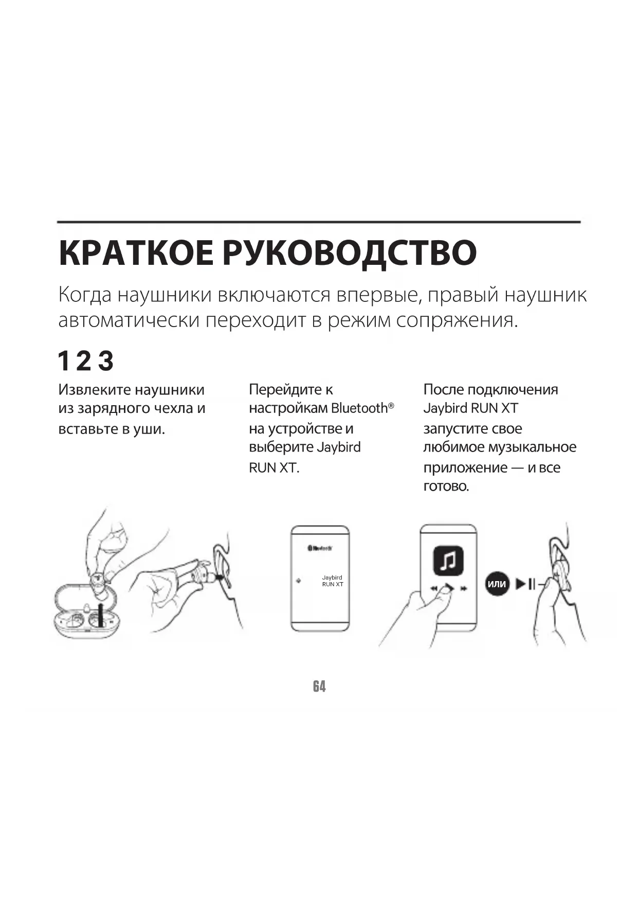 Извлеките наушники из зарядного чехла и вставьте в уши. Перейдите к настройкам Bluetooth® на устройстве и выберите Jaybird RUN XT. После подключения Jaybird RUN XT запустите свое любимое музыкальное приложение— и все