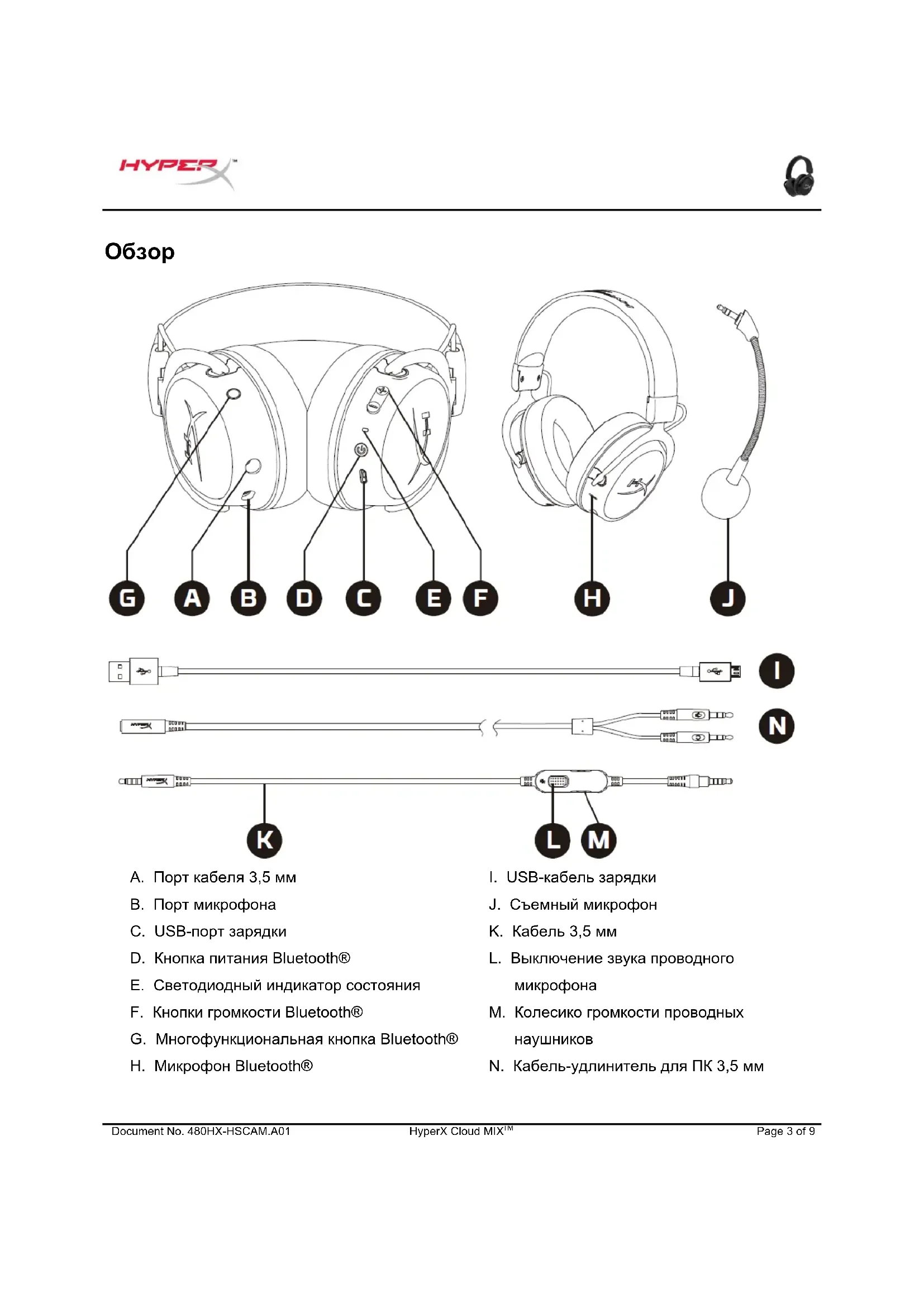J. Съемный микрофон K. Кабель 3,5 мм L. Выключение звука проводного