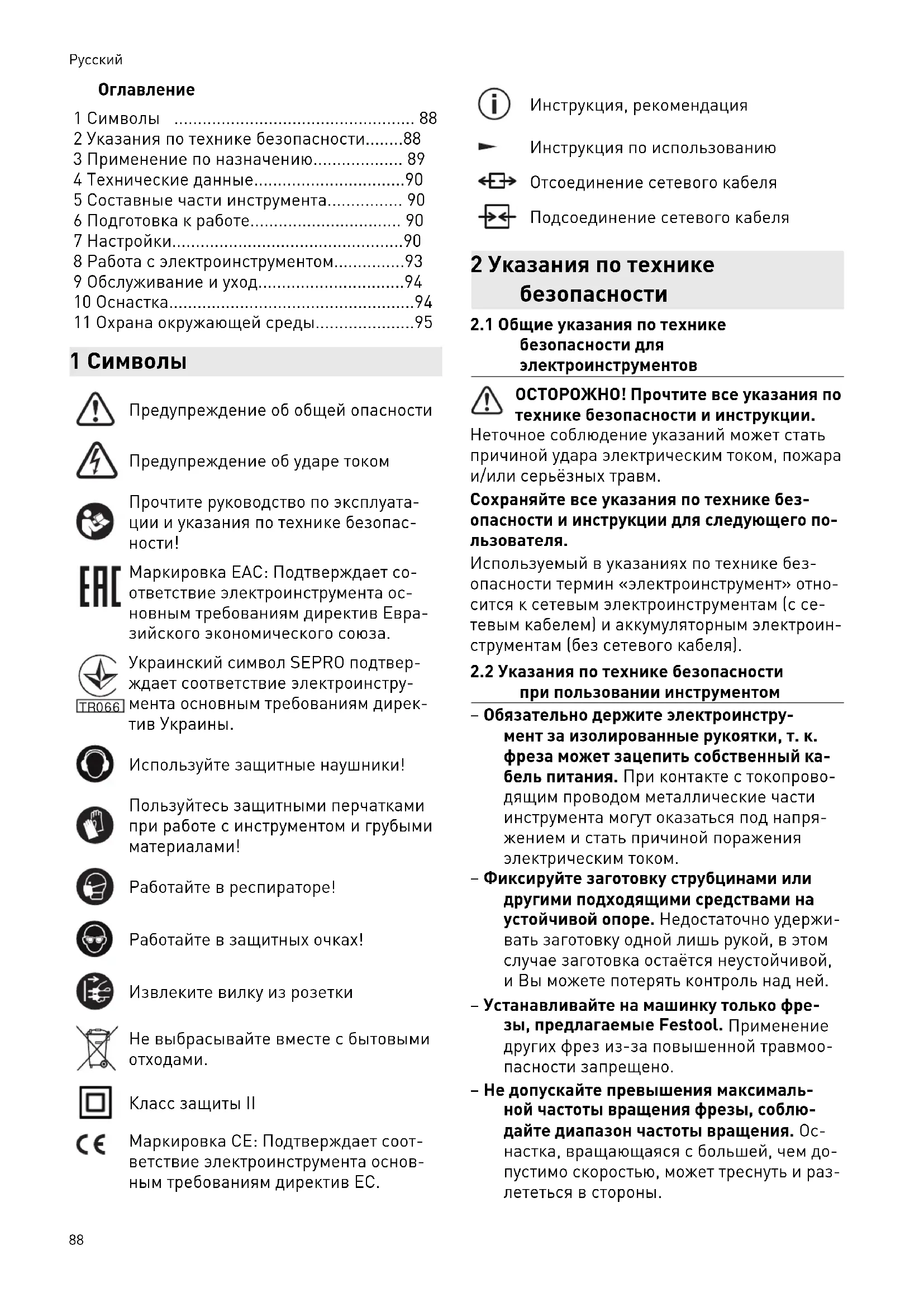 Номера принадлежностей и инструментов для заказа находятся в каталоге Festool или на веб-сайте www.festool.ru. 11 Охрана окружающей среды Не выбрасывайте инструмент вместе с бытовыми отходами! Обеспечьте эко логически безопасную утилизацию ин струментов, оснастки и упаковки. Соблюдайте действующие национальные предписания. Только для стран ЕС: согласно директиве ЕС об отходах электрического и электронного оборудования, а также гармонизированным национальным стандартам отслужившие свой срок электроинструменты должны утилизиро ваться раздельно и направляться на экологи чески безопасную переработку. Информация по директиве REACH: www.festool.com/reach