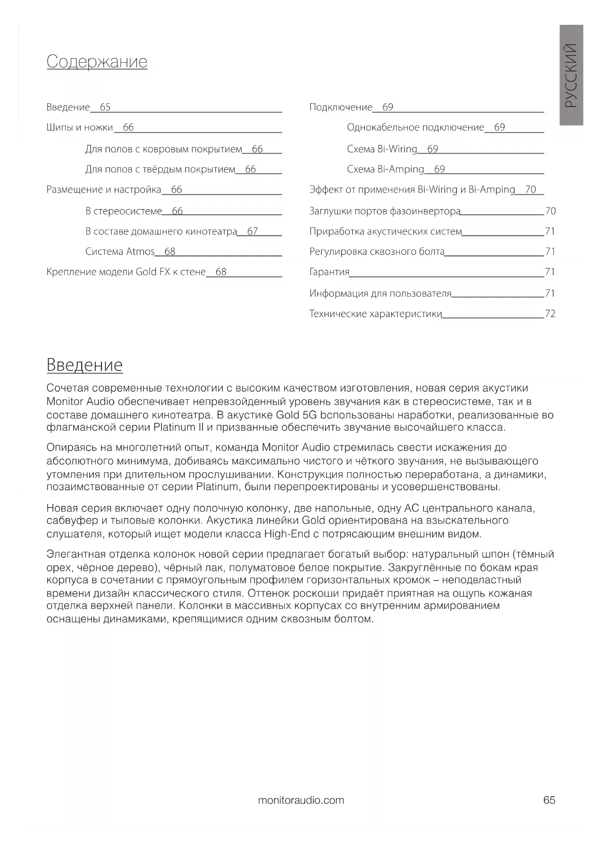 Сочетая современные технологии с высоким качеством изготовления, новая серия акустики Monitor Audio обеспечивает непревзойденный уровень звучания как в стереосистеме, так и в составе домашнего кинотеатра. В акустике Gold 5G bспользованы наработки, реализованные во флагманской серии Platinum II и призванные обеспечить звучание высочайшего класса. Опираясь на многолетний опыт, команда Monitor Audio стремилась свести искажения до абсолютного минимума, добиваясь максимально чистого и чёткого звучания, не вызывающего утомления при длительном прослушивании. Конструкция полностью переработана, а динамики, позаимствованные от серии Platinum, были перепроектированы и усовершенствованы. Новая серия включает одну полочную колонку, две напольные, одну АС центрального канала, сабвуфер и тыловые колонки. Акустика линейки Gold ориентирована на взыскательного слушателя, который ищет модели класса High-End с потрясающим внешним видом. Элегантная отделка колонок новой серии предлагает богатый выбор: натуральный шпон (тёмный орех, чёрное дерево), чёрный лак, полуматовое белое покрытие. Закруглённые по бокам края корпуса в сочетании с прямоугольным профилем горизонтальных кромок – неподвластный времени дизайн классического стиля. Оттенок роскоши придаёт приятная на ощупь кожаная отделка верхней панели. Колонки в массивных корпусах со внутренним армированием оснащены динамиками, крепящимися одним сквозным болтом. Введение 65 Шипы и ножки 66 Для полов с ковровым покрытием 66 Для полов с твёрдым покрытием 66 Размещение и настройка 66 В стереосистеме 66 В составе домашнего кинотеатра 67 Система Atmos 68 Крепление модели Gold FX к стене 68 Подключение 69 Однокабельное подключение 69 Схема Bi-Wiring 69 Схема Bi-Amping 69 Эффект от применения Bi-Wiring и Bi-Amping 70 Заглушки портов фазоинвертора 70 Приработка акустических систем 71 Регулировка сквозного болта 71 Гарантия 71 Информация для пользователя 71 Технические характеристики 72