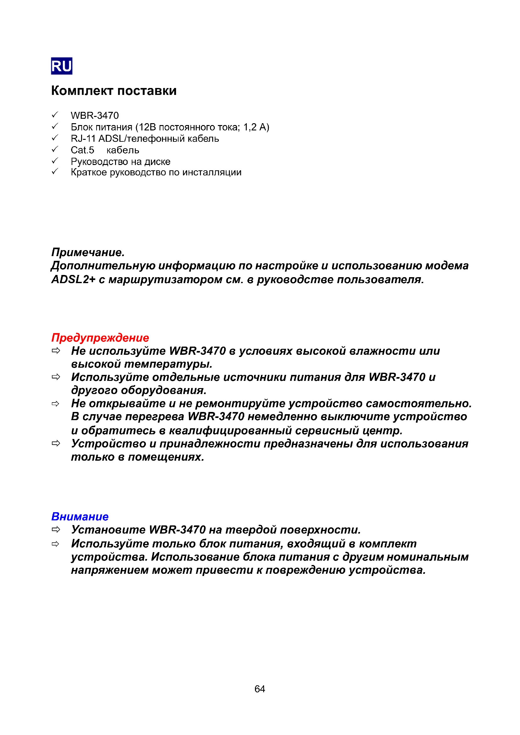 63RU Комплект поставки 3 WBR-3470 3 Блок питания (12В постоянного тока; 1,2 А) 3 RJ-11 ADSL/телефонный кабель 3 Cat.5 кабель 3 Руководство на диске 3 Краткое руководство по инсталляции