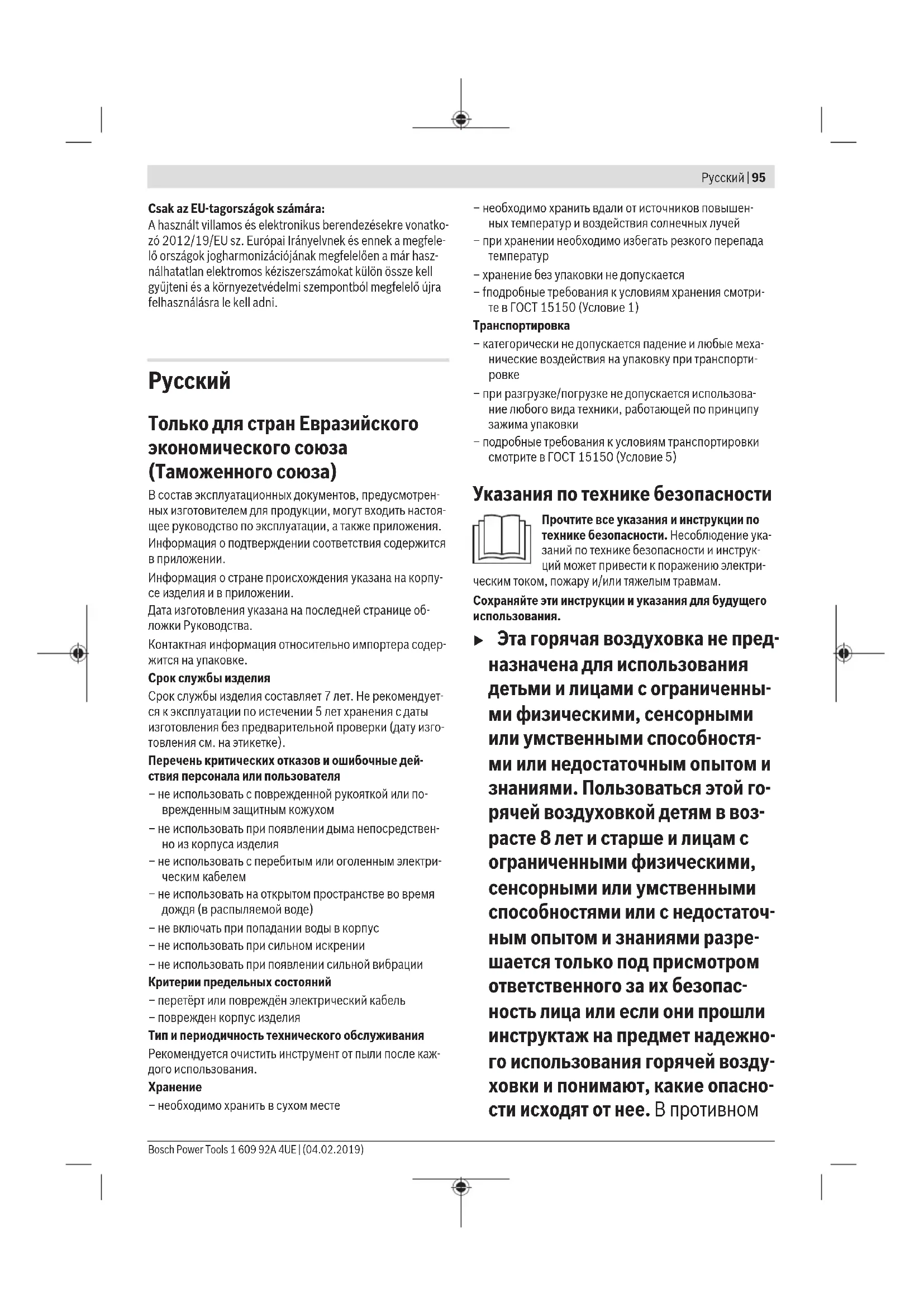 – при разгрузке/погрузке не допускается использова- ние любого вида техники, работающей по принципу зажима упаковки – подробные требования к условиям транспортировки смотрите в ГОСТ 15150 (Условие 5) Указания по технике безопасности Прочтите все указания и инструкции по технике безопасности. Несоблюдение ука- заний по технике безопасности и инструк- ций может привести к поражению электри- ческим током, пожару и/или тяжелым травмам. Сохраняйте эти инструкции и указания для будущего использования. u Эта горячая воздуховка не пред- назначена для использования детьми и лицами с ограниченны- ми физическими, сенсорными или умственными способностя- ми или недостаточным опытом и знаниями. Пользоваться этой го- рячей воздуховкой детям в воз- расте 8 лет и старше и лицам с ограниченными физическими, сенсорными или умственными способностями или с недостаточ- ным опытом и знаниями разре- шается только под присмотром ответственного за их безопас- ность лица или если они прошли инструктаж на предмет надежно- го использования горячей возду- ховки и понимают, какие опасно- сти исходят от нее. В противном Bosch Power Tools 1 609 92A 4UE | (04.02.2019)96 | Русский случае существует опасность не- правильного использования и по- лучения травм. u Присматривайте за детьми во время пользования, при выпол- нении очистки и техобслужива- ния. При этом следите за тем, что- бы дети не играли техническим фе-