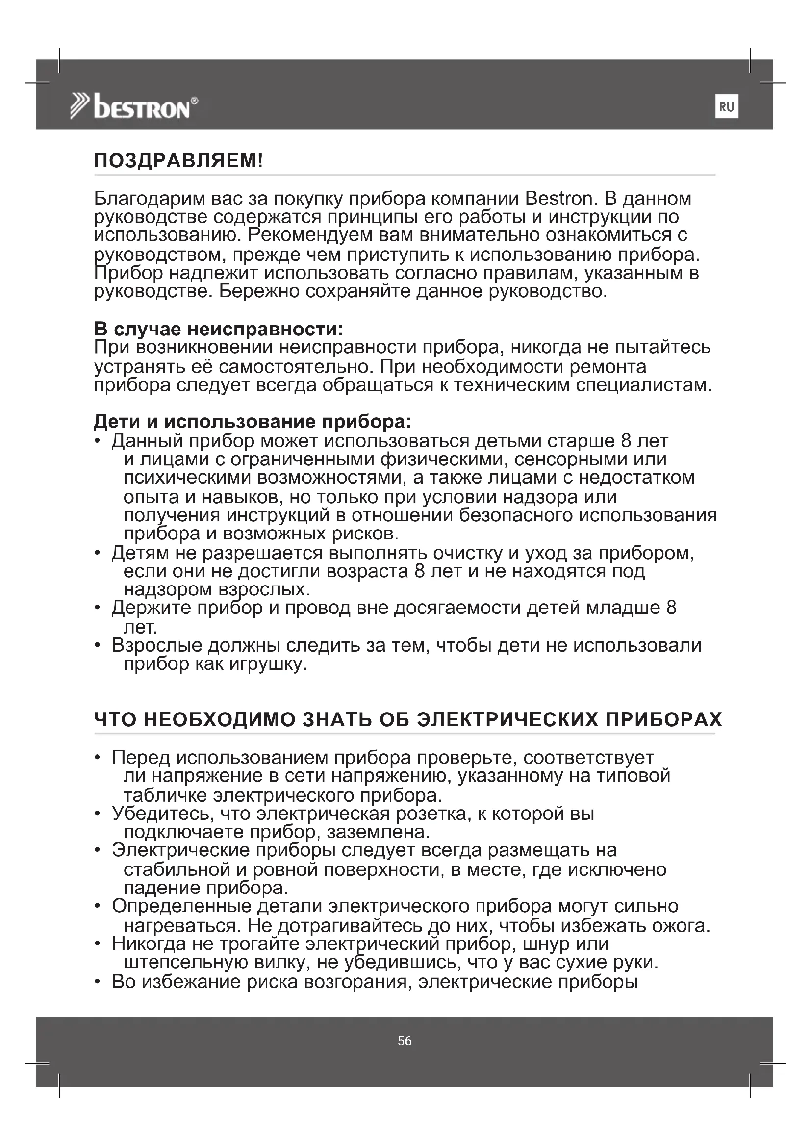 ПОЗДРАВЛЯЕМ! Благодарим вас за покупку прибора компании Bestron. В данном руководстве содержатся принципы его работы и инструкции по использованию. Рекомендуем вам внимательно ознакомиться с руководством, прежде чем приступить к использованию прибора. Прибор надлежит использовать согласно правилам, указанным в руководстве. Бережно сохраняйте данное руководство. В случае неисправности: При возникновении неисправности прибора, никогда не пытайтесь устранять её самостоятельно. При необходимости ремонта прибора следует всегда обращаться к техническим специалистам. Дети и использование прибора:
