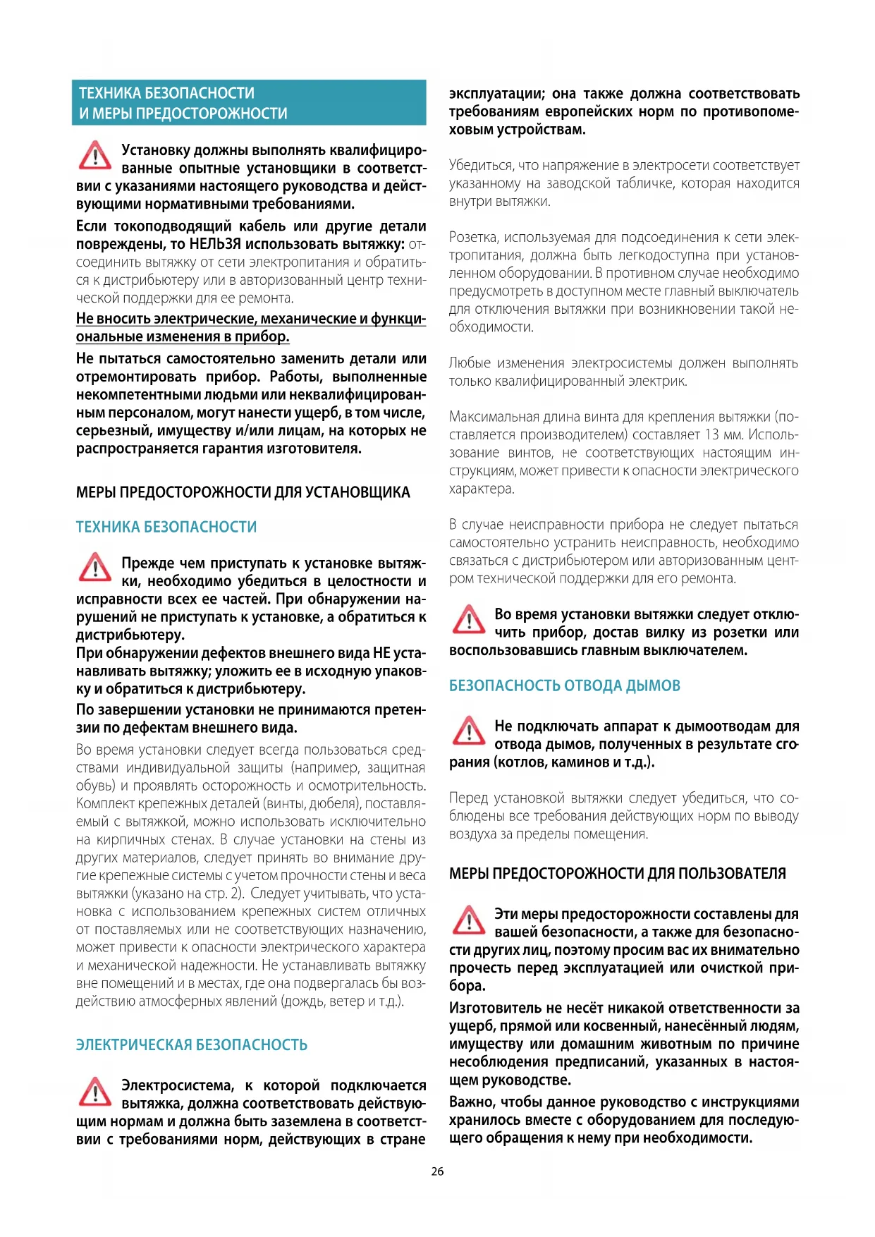 ным персоналом, могут нанести ущерб, в том числе, серьезный, имуществу и/или лицам, на которых не распространяется гарантия изготовителя. МЕРЫ ПРЕДОСТОРОЖНОСТИ ДЛЯ УСТАНОВЩИКА ТЕХНИКА БЕЗОПАСНОСТИ Прежде чем приступать к установке вытяж- ки, необходимо убедиться в целостности и исправности всех ее частей. При обнаружении на