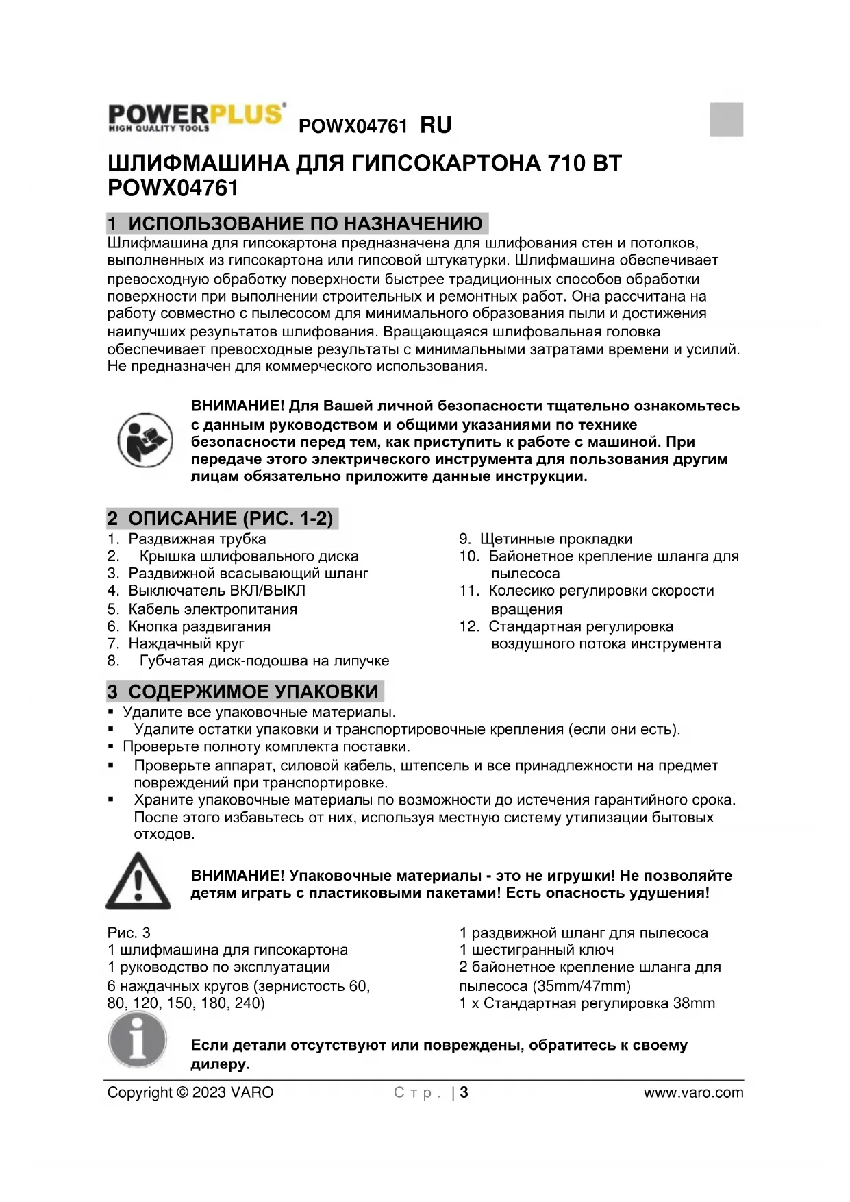 - 15 ДЕКЛАРАЦИЯ О СООТВЕТСТВИИ POWX04761 RU Copyright © 2023 VARO С т р . | 3 www.varo.com ШЛИФМАШИНА ДЛЯ ГИПСОКАРТОНА 710 ВТ POWX04761 1 ИСПОЛЬЗОВАНИЕ ПО НАЗНАЧЕНИЮ Шлифмашина для гипсокартона предназначена для шлифования стен и потолков, выполненных из гипсокартона или гипсовой штукатурки. Шлифмашина обеспечивает превосходную обработку поверхности быстрее традиционных способов обработки поверхности при выполнении строительных и ремонтных работ. Она рассчитана на работу совместно с пылесосом для минимального образования пыли и достижения наилучших результатов шлифования. Вращающаяся шлифовальная головка обеспечивает превосходные результаты с минимальными затратами времени и усилий. Не предназначен для коммерческого использования. ВНИМАНИЕ! Для Вашей личной безопасности тщательно ознакомьтесь с данным руководством и общими указаниями по технике безопасности перед тем, как приступить к работе с машиной. При передаче этого электрического инструмента для пользования другим лицам обязательно приложите данные инструкции. 2 ОПИСАНИЕ (РИС. 1-2) p. 12