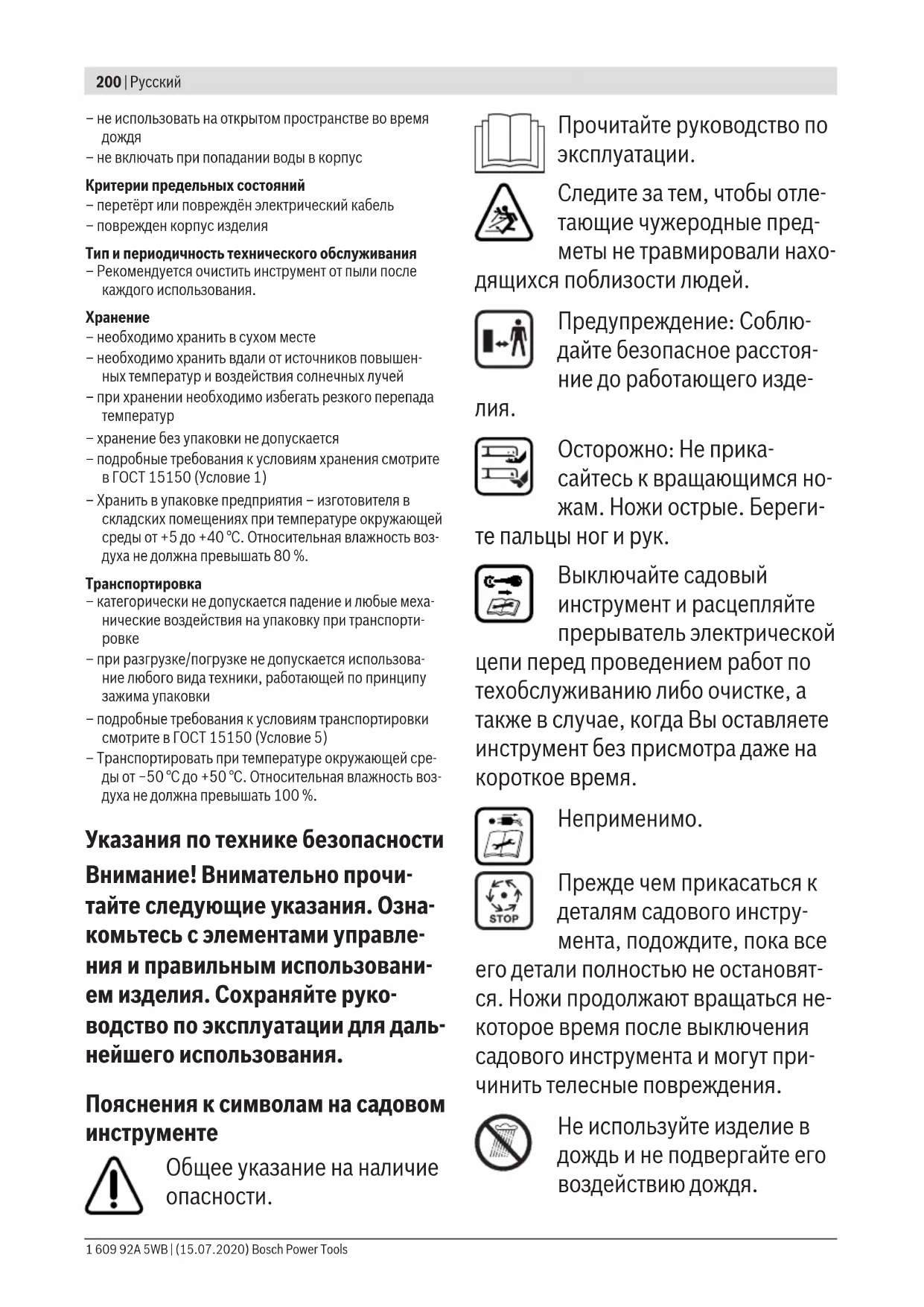 –Будьте особенно осторожны при смене направления на склонах. u Будьте крайне осторожны, если Вы идете спиной вперед или тяне- те садовый инструмент за собой. u При скашивании травы всегда толкайте садовый инструмент перед собой и никогда не подтяги- вайте его к себе. u Ножи должны быть полностью остановлены, если Вам нужно на- клонить садовый инструмент для транспортировки, пересечь уча- сток, не засеянный травой, или уб- рать садовый инструмент с участка/переместить на участок, где Вы производили/намерены производить скашивание. u Не наклоняйте садовый инстру- мент, начиная работу с ним или запуская двигатель. u Включите садовый инструмент, как описано в инструкции по эксплуа- тации, следите за тем, чтобы Ваши ноги были на достаточном расстоя- нии от вращающихся ножей. u Не приближайте руки и ноги к вра- щающимся частям и не подстав- ляйте их под вращающиеся части. u При работе с садовым инструмен- том держитесь на расстоянии от зоны выброса. 1 609 92A 5WB | (15.07.2020) Bosch Power ToolsРусский | 203 u Никогда не поднимайте и не пере- носите садовый инструмент при работающем двигателе. u Следите за тем, чтобы при хране- нии садовый инструмент стоял всеми 4 колесами на земле. u Поднимайте садовый инструмент только за ручку для переноски. Об- ращайтесь с ручкой для переноски