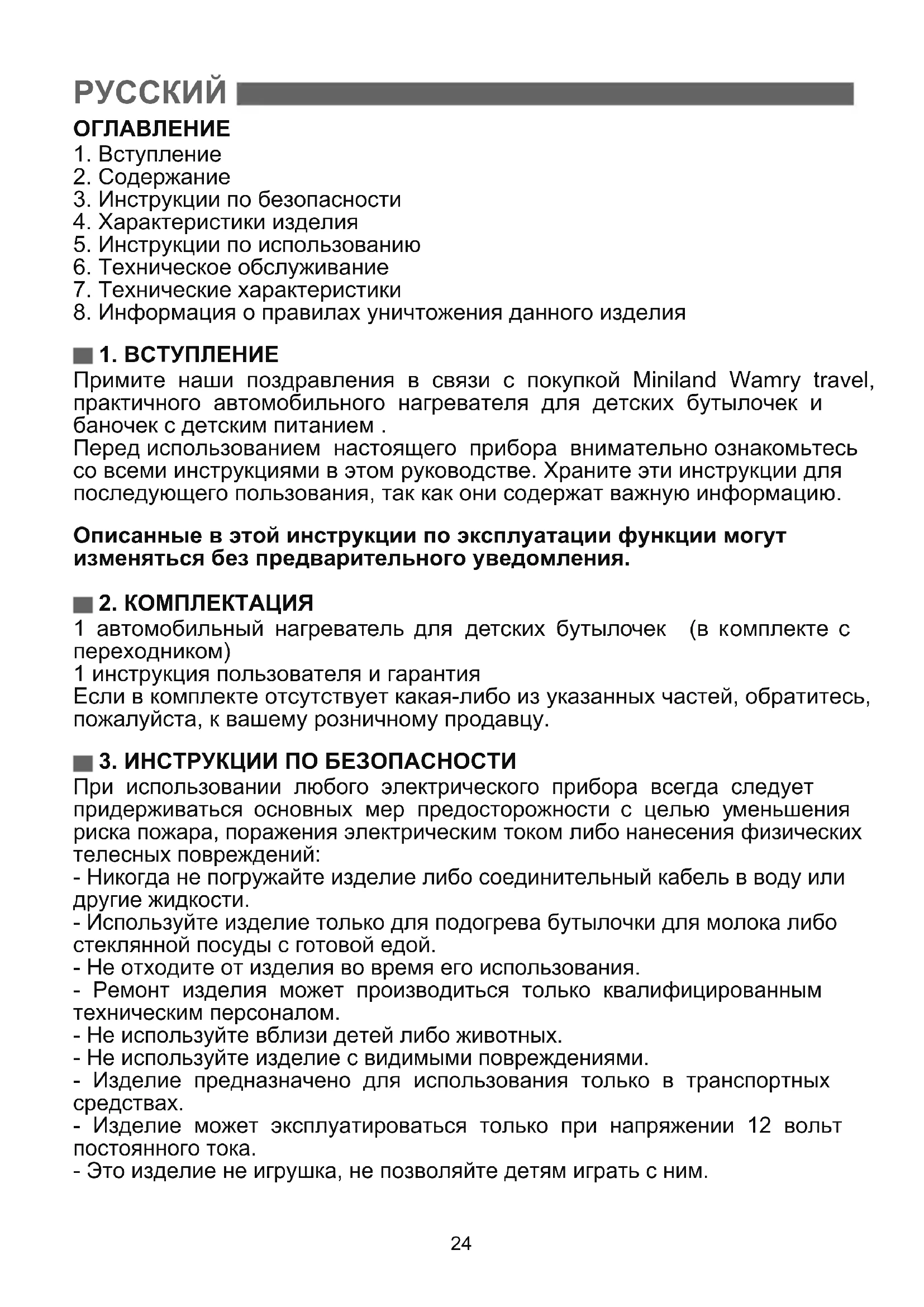 Примите наши поздравления в связи с покупкой Miniland Wamry travel, практичного автомобильного нагревателя для детских бутылочек и баночек с детским питанием . Перед использованием настоящего прибора внимательно ознакомьтесь со всеми инструкциями в этом руководстве. Храните эти инструкции для последующего пользования, так как они содержат важную информацию. Описанные в этой инструкции по эксплуатации функции могут изменяться без предварительного уведомления.